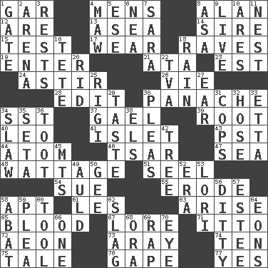 ACROSS 1. Slender fish 4. Not women's 8. Actor Alda or Thicke 12. "We ___ not amused" (Victoria) 13. At sea 14. Beget 15. Trial 17. Erode 18. All-night dance parties 19. Keyboard key 21. _ moment's notice (2 wds.) 23. Eastern Standard Time (abbr.) 24. Moving or stirring 26. Compete 28. Prepare for publication 30. Flamboyance 34. Fast jet (abbr.) 37. Highlander 39. Carrot, for example 40. Lion 41. Small island 43. Pacific Standard Time (abbr.) 44. Smallest unit of an element 46. Russian ruler of old 47. Ocean 48. Electrical Measurement 51. Sew up the eyelids of hawks and falcons 54. Take to court 55. Wear away 58. Fitting 61. French article 63. Ascend 65. Vital fluid 67. Old wives' tales, e.g. 71. "Tell ____ the Marines!" 72. A really long time 73. Like ___ of sunshine 74. "___ Little Indians" 75. Story 76. Open wide 77. Consenting reply DOWN 1. Yard entry 2. Sports stadium 3. Musical pauses 4. Opening into something insatiable 5. Compass dir. 6. Teachers' org. 7. "Two Mules for Sister ____" 8. White ___ sheet 9. Not recorded 10. Ancient Greek god of war 11. A home for chicks 16. Wig 18. Precipitation 20. To free from 22. Federal power corp. 25. Swiss mountan, "Queen of the Mountains" 27. Ewer handle 29. Clothes sense 30. Entreaties 31. 911 reaches them 32. Flexible conduit 33. Singer James 34. Cole _ (cabbage dish) 35. Stalk of a moss capsule 36. A blast of a horn 38. Raised railways 42. Woody plant 45. Mountains (abbr.) 49. Old (Scot.) 50. Unit of force equal to gravity 52. Epoch 53. Australian parrot (variant) 56. Simple song 57. First name in cosmetics 58. Blind as ____ 59. Entreaty 60. Utensil 62. Volcanic refuse 64. Immeasurably long periods of time 66. Single 68. Mouth or opening 69. Hit sharply and swiftly 70. Sight organ