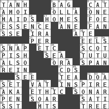 ACROSS 1. Hyperbolic tangent 5. Container for groceries 8. Domesticated feline 11. Mine, in Marseilles 12. Rounded earthenware pot or jar 14. Single 15. Unmarried girls 17. Residences 18. Enemy 19. Center 21. One (Scot) 22. Avid follower 23. Compass dir. 24. Retirement account (abbr.) 25. Had dinner 27. For each 28. Snakelike fish 31. Fastener 35. And so on (abbr.) 37. Highlander 38. Expression of disdain 39. Ocean 41. Ballerina skirt 42. In addition 43. Mouth or opening 45. Connect, as a bridge 46. It's straight from the horse's mouth 47. Music discs 49. Perceive with the eye 51. Afternoon social gathering 52. ___ good deed 55. Put into a specified state 57. Large container 60. Stimulate to action 62. Alias (abbr.) 63. Value system 65. Underwater navigation system 66. Animal enclosure 67. Fly high 68. Suttee (variant) 69. Fast jet (abbr.) 70. Mountains (abbr.) 71. Relationship diagram DOWN 1. Corrects by punishment or discipline 2. Collect or gather 3. Annoying sound 4. Flintstone garb 5. Surprise greeting 6. _ mater 7. Small, secluded valley 8. Java holder (2 wds.) 9. Small Philippine buffalo 10. Adolescent 13. At sea 16. Clip 17. Centers 20. Algonquian 26. Trials 29. Globular water bottle used in Asia 30. Astound 31. Practice fight 32. "Death on the ____" 33. Aide 34. Give a jingle 36. Corporate head (abbr.) 40. Northern region 44. An important port of Yemen 48. Backtalk 50. Nights before holidays 52. Middle Eastern gold or silver currency 53. Declaim 54. Nest on high 55. Plant excrements 56. Supplements with great effort 58. Smallest unit of an element 59. Not this but _ 61. Mail 64. Big collection agency