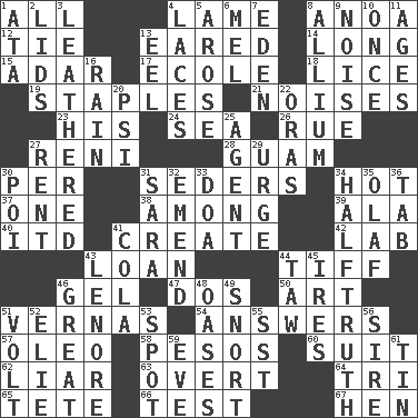 ACROSS 1. Everything 4. Unable to walk 8. Small Philippine buffalo 12. Standoff 13. Having ears or earlike features 14. Yearn 15. The sixth month of the Jewish calendar 17. Learning spot: Fr. 18. Louse (plural) 19. Paper fasteners 21. Annoying sounds 23. Part of HMS, perhaps 24. Ocean 26. Sorrow 27. Painter Guido (1575-1642) 28. Island territory of the United States 30. For each 31. Spring feasts 34. Being at a high temperature 37. Single 38. Amid 39. Chicken ___ king 40. It would 41. Make 42. Experiment locale 43. Grant temporary use of 44. Small quarrel 46. Set 47. Two (Sp.) 50. Nonscientific branch of learning 51. Actresses Bloom and Felton 54. Responses 57. Margarine 58. Mexican monetary units 60. Set of matching outer garments 62. One who doesn't tell the truth 63. Unconcealed 64. Three (prefix) 65. Wig 66. Trial 67. Layer DOWN 1. _ moment's notice (2 wds.) 2. Hats (slang) 3. Resembling or made to resemble leather 4. Shoestrings 5. Came up 6. Cartoonist voice _ Blanc 7. Paradise 8. Plant genus of onion and garlic 9. Annoying sound 10. Single time 11. Eras 13. Snakelike fish 16. Precipitation 20. 23rd letter of the Greek alphabet 22. Mouths or openings 25. Representative 27. Monthly bill 29. Goad 30. Luau course 31. "Two Mules for Sister ____" 32. Make improvements or corrections to 33. ___ good deed 34. Not exactly gospel 35. Norwegian king 36. Bar bill 41. Root beer relative 43. Poe poem 44. The 23rd letter of the Hebrew alphabet 45. Angers 46. Relatively large 48. Fertile tracts in a desert 49. Derisive sound 51. Electrical Unit 52. Writer Wiesel 53. Blemish 55. Fast jet (abbr.) 56. Male parent of an animal 59. Night before a holiday 61. Shallow baking pan