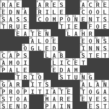 ACROSS 1. Actress Charlotte 4. Ancient Greek god of war 8. 1/640 square mile 12. Pulitzer Prize-winning author Ferber 14. Cause heat under the collar 15. Calm and collected 16. Backtalk 17. Pieces 20. Loyal 21. Neckwear 22. Enemy 23. Eroded 27. Cowardly lion portrayer 29. _ vera 31. Immeasurably long periods of time 34. Stared at amorously 35. Restaurants 36. Balmoral and tarboosh 39. Experiment locale 41. Proofreading order 42. Mine, in Marseilles 43. It is permitted: Lat. 46. Light colored 47. Dutch treat 48. Musical group of three 51. Feeling sharp psychological pain 54. Slender fish 56. It is 58. ____ Jay Lerner 61. Appease 66. Ancient Roman robe 67. Portico 68. Female horse 69. Nights before holidays 70. Transmit 71. Ache 72. Eastern Standard Time (abbr.) DOWN 1. State of inaction 2. The sixth month of the Jewish calendar 3. Follow as a consequence or result 4. Curve 5. River (Sp.) 6. Shade tree 7. Back-to-school mo. 8. Adept person 9. Meet 10. Printing process, for short 11. Otherwise 13. Toward the sea 18. Petroleum 19. Teachers' org. 24. Label 25. Pipe bend 26. Christmas carol 28. Robbery 30. Peak District village in England 32. Compass dir. 33. Fast jet (abbr.) 34. Flexible twig of a willow tree 36. Head covering 37. Nursemaid (var.) 38. Coward 40. Auction offers 44. Feline 45. Australian flightless bird 49. One more than two 50. Baseball player Mel 52. Nathan's nickname 53. Michael Jackson trademark 54. Global Positioning Systems (abbr.) 55. Johnson of "Laugh-In" 57. Simple or foolish person 59. Matures 60. Political cartoonist Thomas 62. Writing tablet 63. Auto club (abbr.) 64. Three (prefix) 65. Car or cant ending