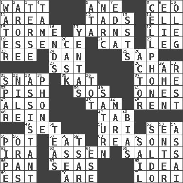 ACROSS 1. Electrical Unit 5. One (Scot) 8. Corporate head (abbr.) 11. Type of rug 12. Bits 14. Pipe bend 15. Singer Mel 17. Entertaining tales 18. Whopper 19. Center 21. Feline 22. Part of a journey 23. To sift 24. One of the 12 tribes of Israel 25. Plant excrement 27. Fast jet (abbr.) 28. Burn to charcoal 31. Fastener 35. Krazy ___ of comics 37. Heavy book 38. Expression of disdain 39. Mayday 41. Washington bills 42. In addition 43. Scottish cap 45. Monthly bill 46. It's straight from the horse's mouth 47. Keyboard key 49. Put into a specified state 51. RI univ. 52. Ocean 55. Plant holder 57. Erode 60. Thinks logically 62. Lyricist Gershwin 63. NE Netherlands city 65. Table seasonings 66. Baking dish 67. Oceans 68. It may be bright or harebrained 69. Eastern Standard Time (abbr.) 70. "We ___ not amused" (Victoria) 71. Australian parrot (variant) DOWN 1. Wetness 2. Came up 3. Laconic 4. Not wild 5. _ moment's notice (2 wds.) 6. Drug cop 7. Pulitzer Prize-winning author Ferber 8. Portable communications device 9. Writer Wiesel 10. Cassini of fashion 13. Fast planes 16. Extremities 17. Gossips 20. Keg 26. Thespian 29. So be it 30. Relief 31. Practice fight 32. The longest river in the world 33. Helper 34. Give a jingle 36. Small child 40. Titan orbits this 44. Female horse 48. Prejudice 50. Afternoon social gatherings 52. Twentieth part of a lira 53. Keyboard key 54. Slender Brazilian palm 55. Corncob 56. Mouths or openings 58. Toward the sea 59. Russian ruler of old 61. Travel by water 64. Compass dir.