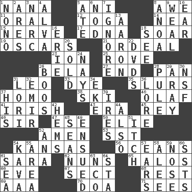 ACROSS 1. Grandmother 5. Black tropical American cuckoo 8. Deep reverence 11. Of the mouth 12. Ancient Roman robe 14. Teachers' org. 15. Boldness 17. Pulitzer Prize-winning author Ferber 18. Fly high 19. Motion picture awards 21. Severe or trying experience 23. Electrically charged atom 25. Be footloose 26. Actor Lugosi 27. Conclusion 28. Baking dish 31. Lion 33. Color 35. Runs notes together 37. Same (prefix) 38. What Jean-Claude Killy likes to do 40. Norwegian king 41. From or relating to Ireland 43. Epoch 45. Marina Del _, California 46. Title for a knight 47. Compass dir. 50. Writer Wiesel 52. So be it 53. Fast jet (abbr.) 54. Sunflower state 56. Seas 61. "Two Mules for Sister ____" 62. Religious women 65. Auras 66. Night before a holiday 67. Religious group 68. Take ten 69. American Automobile Association (abbr.) 70. ___ good deed 71. Perceives with the eye DOWN 1. Words to Nanette 2. Ancient Greek god of war 3. Drug cop 4. Inventor's middle name 5. Had dinner 6. Dreamland 7. Disregard 8. Small Philippine buffalo 9. Welt 10. Ewer handle 13. Composer Copland 16. One of the Great Lakes 18. Observe 20. Disposed of to a purchaser 22. Movie discs 24. Negative votes 26. Scornful sounds 28. Whimper 29. Like ___ of sunshine 30. Overdraft (abbr.) 31. Australian parrot (variant) 32. Arab leader 34. Make supply last 36. Old wives' tales, e.g. 37. Part of HMS, perhaps 39. Angers 42. Equivocates 44. In addition 48. Seines 49. Followed as a consequence or result 51. Hankering 52. Santa ___, CA 54. Polynesian shrub of the pepper family 55. Type of rug 57. Hearing organs 58. Toward shelter 59. Sense of smell 60. Fast planes 61. Ocean 63. Non-commissioned officer (abbr.) 64. R.R. building