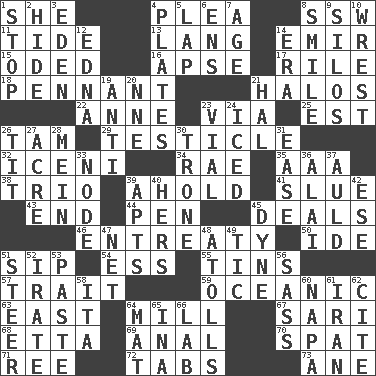 ACROSS 1. A female animal or person 4. Entreaty 8. Compass dir. 11. Periodic rise and fall of the sea level 13. Austrian-born American filmmaker Fritz 14. Independent ruler or chieftain 15. Wrote a lyric poem 16. Domed church section 17. Cause heat under the collar 18. Pre-World Series prize 21. Saint headwear 22. Singer Murray 23. By way of 25. Eastern Standard Time (abbr.) 26. Scottish cap 29. One of the two male reproductive glands 32. Ancient Celtic tribe of eastern Britain 34. Actress Charlotte 35. Auto club (abbr.) 38. Musical group of three 39. Hold, grip (Informal) 41. Turn sharply 43. Conclude 44. Fenced enclosure 45. Allots cards 46. Plea 50. Binary compound 51. Small drink 54. Curvy letter 55. Airtight sealed metal containers 57. Distinguishing feature 59. Pertaining to the sea 63. 90 degrees 64. Place where flour is made 67. Indian skirt 68. Singer James 69. Of or related to the anus 70. Argument over a trivial matter 71. Portuguese money of account (variant) 72. Bar bills 73. A saturated hydrocarbon DOWN 1. Close up, plug up 2. Flintstone garb 3. Paradise 4. Food holders 5. Pet locale 6. Followers of ems 7. Ripen 8. Grin 9. Grain storage towers 10. Obtain by seizing forcibly or violently 12. Pulitzer Prize-winning author Ferber 14. Epoch 19. Opposed to 20. Compass dir. 21. Actor Linden 23. Small bottle 24. On the rocks 26. Teat (slang) 27. 1/640 square mile 28. Count _ (2 wds.) 30. Marketplace scale 31. Relaxation 33. Thickened enlargement 36. Jai _ 37. Old (Scot.) 39. Flats, for short 40. Possessive pronoun 42. Compass dir. 45. Unit of force 47. Fish or hair follower 48. Ringlike coral islands and reefs 49. Nervous spasm 51. Guide 52. Feeling or showing extreme anger 53. Thick mixture 56. Backtalk 58. Call ___ day 60. California wine valley 61. SW Asia republic 62. Quote 64. Floor protector 65. _ tizzy (2 wds.) 66. Experiment locale