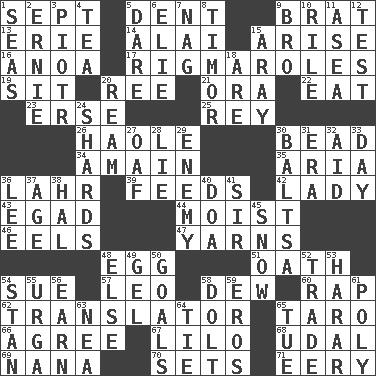 ACROSS 1. Back-to-school mo. 5. Undesirable depression on a surface 9. Naughty child 13. One of the Great Lakes 14. Jai _ 15. Get up 16. Small Philippine buffalo 17. Complicated, petty procedures 19. Be seated 20. Portuguese money of account (variant) 21. Mouth or opening 22. Ingest 23. Celtic language 25. Marina Del _, California 26. White Person, in Hawaii 30. Necklace unit 34. With great haste 35. Roberta Peters solo 36. Cowardly lion portrayer 39. Eats 42. Kenny Rogers chart-topper in '80 43. Mild oath 44. Damp 46. Snakelike fish 47. Tall tales 48. Oval reproductive body of a fowl 51. Pledge 54. Take to court 57. Lion 58. Morning condensation 60. Reproach for some lapse or misdeed 62. Interpreter 65. Pacific island yam 66. Match 67. _ and Stitch 68. Hereditary estate 69. Grandmother 70. Arranges properly for use 71. Suggestive of the supernatural DOWN 1. Oceans 2. Bert's buddy 3. Peter (Polish) 4. Afternoon social gathering 5. Have the gumption 6. Writer Wiesel 7. Tired old horse 8. The easternmost of the Lesser Sundas 9. Sis' sibling 10. Cause heat under the collar 11. Toward the sea 12. Trial 15. Like ___ of sunshine 18. "We ___ not amused" (Victoria) 20. 480, 500 or 516 sheets of paper 24. Broken pieces 27. Clumsy lout 28. Whopper 29. Foe 30. Greek mezzo-soprano Agnes 31. Period 32. Assist 33. 24 hours 36. Area sheltered from the wind 37. Grow older 38. Actor Linden 40. ___ good deed 41. Title for a knight 45. Frozen precipitation 48. Otherwise 49. Set 50. Scores awarded for successful feats 52. Exchange 53. Ethiopian city, capital of Harari 54. Comedian Laurel of Laurel & Hardy 55. Capital and largest city of Mongolia 56. Merit 58. Stupid person 59. Greek god of love 61. More than one (prefix) 63. Teachers' org. 64. Standoff 65. Third day of the wk.