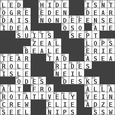 ACROSS 1. Directed 4. Flintstone garb 8. Is not 12. Legendary monster 14. Genesis locale 15. Letter starter 16. Raised platform 17. Unrelated to defense, as in spending 20. The main thing one is thinking about 21. Bear (Spanish) 22. Had dinner 23. Sets of matching outer garments 27. Back-to-school mo. 29. Ardor 31. Chops off 34. Calif. Air Force Base 35. 4th largest of the Great Lakes 36. Pull into pieces 39. Bit 41. Toward the sea 42. Hero or heavy, e.g. 43. Amusement-park features 46. Capri or Wight 47. Famous astronaut Armstrong 48. Lyric poems 51. Writing tables 54. The first octave above the treble staff 56. Away 58. Silent film actress Nazimova 61. Happening in regular succession 66. Distinctive style or manner 67. Ship's personnel 68. Writer Wiesel 69. Axlike tool, used for shaping wood 70. Stitch closed the eyes of (a falcon) 71. Pinches, bites 72. Compass dir. DOWN 1. Farming town in central California 2. Mild oath 3. Frees from moisture 4. Layer 5. Wedding promise 6. Lair 7. Inside; within (prefix) 8. Binary compound 9. Legislators 10. Political cartoonist Thomas 11. Relationship diagram 13. He sold his birthright 18. Curvy letter 19. Enemy 24. Ending with capital 25. Beverage made from leaves 26. Table seasoning 28. Entreaties 30. Acquire or gain knowledge or skills 32. Sliced dessert 33. Ocean 34. A special lineage 36. Three (prefix) 37. Greek goddess of the dawn 38. One to whom something is allotted 40. Passed on 44. Expire 45. Raised railways 49. Newt 50. _ Lanka 52. Polynesian shrub of the pepper family 53. Bobsleighs 54. Arches 55. Old wives' tales, e.g. 57. Baking chamber 59. Belonging to Elizabeth 60. Afresh 62. Leather borer 63. Biblical high priest 64. Mouth edge 65. Affirmative reply