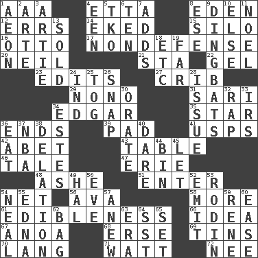 ACROSS 1. American Automobile Association (abbr.) 4. Singer James 8. Genesis locale 12. Blunders 14. Supplemented with great effort 15. Grain storage tower 16. Von Bismarck 17. Unrelated to defense, as in spending 20. Famous astronaut Armstrong 21. R.R. building 22. Set 23. Proofreads 27. Baby bed with high sides 29. Words to Nanette 31. Indian skirt 34. _ Allan Poe 35. Play the lead 36. Extremities 39. Groovy apt. 41. United States Postal Service (abbr.) 42. Collude with 43. Eating place 46. Falsehood 47. One of the Great Lakes 48. American tennis player Robert 51. Keyboard key 54. Fish or hair follower 56. Actress Gardner 58. Greater amount 61. The property of being fit to eat 66. The content of cognition 67. Small Philippine buffalo 68. Celtic language 69. Canisters 70. Long (Scottish) 71. Electrical Unit 72. Born DOWN 1. Period of immesurable duration 2. Johnson of "Laugh-In" 3. Nick name for Arthur 4. Car or cant ending 5. Ring climax 6. "___ Little Indians" 7. Does sums 8. Compass dir. 9. Empty-headed or silly people 10. Otherwise 11. Christmas carol 13. Exchanged or delivered for money 18. And so on (abbr.) 19. At a great distance 24. Indiana (abbr.) 25. Coat; cloak 26. Fastener 28. Come out of 30. Declaim 32. Strike 33. Big collection agency 34. _____ Park, CO 36. Erode 37. Basketball assoc. 38. Conveyance 40. Have the gumption 44. Storage container 45. Allow 49. Actor Linden 50. Night before a holiday 52. Send forth 53. "The Thinker" sculptor 54. Actress Patricia 55. Pulitzer Prize-winning author Ferber 57. Afresh 59. French philosopher Descartes 60. Relaxation 62. Container for groceries 63. Epoch 64. Fast jet (abbr.) 65. Arrange properly for use