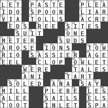 ACROSS 1. Allow 4. Thick mixture 9. Entreaty 13. Wedding promise 14. Soup utensil 15. One who doesn't tell the truth 16. By way of 17. For Whom the Bell _____ 18. Measure of real estate 19. Begley and Asner 21. Portuguese money of account (variant) 22. Settings 24. Set of matching outer garments 26. Single 27. Distance measurement 29. Beer foam 30. Came up 31. Charged atoms 33. Pull behind 36. River (Sp.) 37. More impudent 40. Ripen 41. Snakelike fish 42. Hoof sound 43. A small or young owl 45. We are 47. Falsehoods 48. Black tropical American cuckoo 49. Small pie 50. Having a sole or soles 52. Santa ___, CA 54. Declare 56. Place where flour is made 57. Military trainee 59. Part of a journey 61. Toward shelter 62. Moves on water 63. Raised railways 64. A blast of a horn 65. An arm off of a larger body of water 66. Health resort DOWN 1. 54 in ancient Rome 2. Singer Brickell 3. Inedible or poisonous agaric 4. Pacific Standard Time (abbr.) 5. To the left, to Queeg 6. Flatfish 7. Lacquered or enameled metalware 8. Followers of ems 9. Food holders 10. Louse (plural) 11. Hearing organs 12. "We ___ not amused" (Victoria) 20. Institutes legal proceedings 22. Lush 23. Indiana (abbr.) 25. Angers 27. Female horse 28. One of the Great Lakes 29. Clip 31. Capri or Wight 32. Bear (Spanish) 33. Baron Munchausen's specialties 34. Double curve, resembling the letter S 35. Moistens 38. Sour-tasting 39. Roll call or roster of names 44. Armed conflicts 45. Place for singles 46. Compass dir. 49. Eating place 50. Grain storage tower 51. Margarine 52. ____ Jay Lerner 53. Famous astronaut Armstrong 55. Sharp bark 56. Floor protector 57. 23rd letter of the Greek alphabet 58. Eastern Standard Time (abbr.) 60. Girls' org. (abbr.)