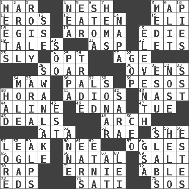ACROSS 1. Third mo. 4. Soft 8. Atlas unit 11. Greek god of love 13. Ingested 15. Biblical high priest 16. Armor plate that protects the chest 17. Odor 18. Singer Brickell 19. Stories 21. Viper 22. Allows 23. Cunning 24. Elect 27. Mature 29. Fly high 30. Baking chambers 34. Opening into something insatiable 36. Friends 39. Mexican monetary units 40. Israeli folk dance 41. Goodbye (Sp.) 43. Political cartoonist Thomas 44. Place in a line 46. Pulitzer Prize-winning author Ferber 47. Third day of the wk. 48. Allots cards 49. Bowlike part 51. _ moment's notice (2 wds.) 53. Actress Charlotte 54. A female animal or person 57. Path through which fluid escapes 60. Born 63. Stares at amorously 65. Stare at amorously 66. Relating to or accompanying birth 69. Table seasoning 70. Reproach for some lapse or misdeed 71. Bert's buddy 72. Competent 73. Begley and Asner 74. Suttee (variant) 75. Mayday DOWN 1. Confronts 2. Therefore, facetiously 3. Agitated, as a liquid 4. Teachers' org. 5. Hearing organ 6. Portico 7. Is hesitant and indecisive 8. Ancient Persian 9. Set down 10. Sliced desserts 12. Compass dir. 14. California wine valley 18. Veterans Day date 20. "Barney Miller" actor Jack 25. Dad 26. Barter 28. Republican Party 29. Tchaikovsky ballet 31. He sold his birthright 32. Olfactory organ 33. Fast jet (abbr.) 34. Undercover agent 35. Operatic vocal solo 37. Hat (slang) 38. Echolocation 40. Possessed 42. "Two Mules for Sister ____" 45. Eastern Standard Time (abbr.) 50. Corporate head (abbr.) 52. Singer Murray 54. Broad, flat, thick pieces 55. Phone greeting 56. _____ Park, CO 57. Old wives' tales, e.g. 58. Mild oath 59. High mountains 61. Hearing organs 62. Inactive volcano in Sicily 64. Girls' org. (abbr.) 67. Small island 68. Flowery wreath
