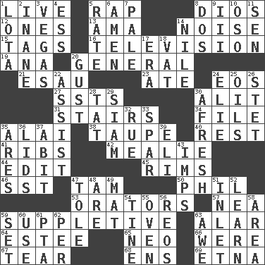 ACROSS 1. Not recorded 5. Reproach for some lapse or misdeed 8. "Vaya con ____" 12. Singles 13. Housemaid (var.) 14. Annoying sound 15. Labels 16. Household entertainment appliance 19. Santa ___, CA 20. Commissioned military rank 21. Son of Isaac 23. Had dinner 24. Greek goddess of the dawn 27. Fast planes 30. Set down 31. Flight of steps 34. Do some clerical work 35. Mountain range southwest of Kyrgyzstan 38. Grayish beige 40. Take ten 41. Teases 42. Ear of corn 44. Prepare for publication 45. Basketball hoops 46. Fast jet (abbr.) 47. Scottish cap 50. Silvers or Donahue 53. Speakers 57. Teachers' org. 59. Supplying deficiencies 63. Having or resembling wings 64. First name in cosmetics 65. Modern: prefix 66. We are 67. Pull apart 68. Followers of ems 69. Inactive volcano in Sicily DOWN 1. Globular water bottle used in Asia 2. Silly 3. Viva Las _ 4. Double-curved letter 5. Pace 6. So be it 7. Light colored 8. Two (Sp.) 9. One more than two 10. Bear (Spanish) 11. Elected rep. 14. "Death on the ____" 17. Epoch 18. Large container 20. Abrupt rush of wind 22. Help 24. Writer Wiesel 25. Petroleums 26. Proofreading order 28. Make lace 29. Thailand, formerly 30. Anew 32. Regret 33. Coast Guard woman 35. Ancient Greek god of war 36. Flaplike coverings 37. "This won't hurt ____!" 39. Connecticut Ivy Leaguer 43. Naughty children 47. Lacquered or enameled metalware 48. "We ___ not amused" (Victoria) 49. Floor covering 51. An arm off of a larger body of water 52. Acquire or gain knowledge or skills 54. Prong on a fork 55. Baking chamber 56. Vintage cars 58. Length times width 59. Arrange properly for use 60. Purpose 61. Parent Teacher Assoc. 62. For each 63. Deep reverence