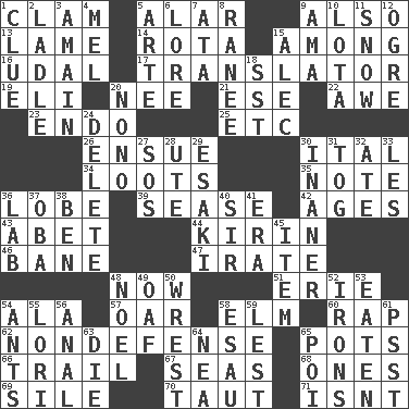 ACROSS 1. Burrowing marine mollusk 5. Having or resembling wings 9. In addition 13. Unable to walk 14. Round or rotation of duties 15. Amid 16. Hereditary estate 17. Interpreter 19. Connecticut Ivy Leaguer 20. Born 21. Compass dir. 22. Deep reverence 23. Inside; within (prefix) 25. And so on (abbr.) 26. Take place subsequently 30. Slanted text style (abbr.) 34. Plunders 35. Observe 36. Ear part 39. Gospel singer Marvin 42. Eons 43. Collude with 44. Japanese brewing company 46. Object of repulsion 47. Feeling or showing extreme anger 48. Immediately 51. One of the Great Lakes 54. In the manner of 57. Boat paddle 58. Shade tree 60. Strike 62. Unrelated to defense, as in spending 65. Plant holders 66. Get behind 67. Oceans 68. Washington bills 69. Filth; sediment 70. Drawn tight 71. Is not DOWN 1. A slight indication 2. Dipping utensil 3. With great haste 4. Cartoonist voice _ Blanc 5. Johnson of "Laugh-In" 6. Old wives' tales, e.g. 7. _ moment's notice (2 wds.) 8. The wife of a rajah (variant) 9. Nanny (var.) 10. Globular water bottle used in Asia 11. Overwhelm 12. Legendary monster 15. Actor Baldwin 18. Fast jet (abbr.) 20. Words to Nanette 24. Erase 27. Distress signal 28. Shoshoni 29. 1973 Nobel Price Winner (Physics) Leo 30. More lacking in sense or substance 31. Coat; cloak 32. Had dinner 33. French article 36. Experiment locale 37. Chief or king in Benin or Nigeria 38. Benjamin's nick name 40. Title for a knight 41. Epoch 45. A whole individual unit 48. Christmas carol 49. Clumsy lout 50. Obtain by seizing forcibly or violently 52. Metal shackles 53. Eroded 54. Pismires 55. Australian parrot (variant) 56. Of or related to the anus 58. He sold his birthright 59. For fear that 61. Inconspicuous attention getter 63. Pass on 64. Teachers' org. 65. Luau course