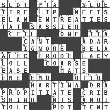 ACROSS 1. Narrow opening 5. Parent Teacher Association (abbr.) 8. Turn sharply 12. Hoop that covers a wheel 13. Mouth edge 14. Confronts 15. Style 16. Pleas 19. Make lace 20. More disrespectful 21. To provide with a ceiling 23. Single 24. Call ___ day 27. Patter 30. The sixth month of the Jewish calendar 31. Snub 34. Actor Lugosi 35. Actor Baldwin 38. Wear away 40. Made of lace 41. Hang loosely or laxly 42. Rough 44. Relaxation 45. Floor coverings 46. Compass dir. 47. Australian flightless bird 50. Von Bismarck 53. Chrissie's court nemesis 57. Mouth or opening 59. Appease 63. Baby bed with high sides 64. Bake eggs in their shells 65. Mountains (abbr.) 66. Mine, in Marseilles 67. Lacquered or enameled metalware 68. Cooking vessel 69. Portable shelter DOWN 1. Proofreading order 2. Pale purple color 3. Speak pompously 4. Nine, plus one 5. Entreaty 6. Canisters 7. Tenement units (abbr.) 8. Arrange properly for use 9. Luau accessory 10. Shoshoni 11. Curvy letter 14. Female horse 17. River (Sp.) 18. Car or cant ending 20. Volcanic refuse 22. Ice on the eave 24. It may be bright or harebrained 25. Baby powder 26. Like ___ of sunshine 28. Compass dir. 29. Torque (variant) 30. Most capable 32. Friend of Pooh 33. Dutch treat 35. Toward shelter 36. Grant temporary use of 37. Otherwise 39. Epoch 43. Portico 47. Independent ruler or chieftain 48. Floor protector 49. RI univ. 51. Singer Mel 52. Greek mythologigal hunter 54. Pack (down) 55. "Tell ____ the Marines!" 56. Egg locale 58. "This won't hurt ____!" 59. Pacific Standard Time (abbr.) 60. 17th letter of the Greek alphabet 61. Petroleum 62. Before (prefix) 63. Domesticated feline