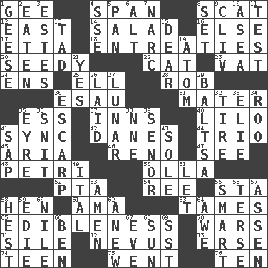 ACROSS 1. Unit of force equal to gravity 4. Connect, as a bridge 8. Get outta here! 12. 90 degrees 14. Vegetable dish 16. Otherwise 17. Singer James 18. Pleas 20. Morally degraded 22. Domesticated feline 23. Large container 24. Followers of ems 25. Pipe bend 28. Director Reiner 30. Son of Isaac 31. Mother 35. Curvy letter 37. Taverns 40. _ and Stitch 41. Synchronize (abbr.) 42. Natives or inhabitants of Denmark 44. Musical group of three 45. Roberta Peters solo 46. Western Nevada city 47. Perceive with the eye 48. _ dish (used to culture cells) 50. Water jar 52. Parent Teacher Association (abbr.) 54. To sift 55. R.R. building 58. Layer 61. Wet nurse (var.) 63. Corrects by punishment or discipline 65. The property of being fit to eat 70. Armed conflicts 71. Drop; flow; fall 72. Mole, birthmark 73. Celtic language 74. Adolescent 75. Left 76. Nine, plus one DOWN 1. Honkers 2. Ingested 3. _____ Park, CO 4. Compass dir. 5. Baking dish 6. Keyboard modifier key 7. Drug cop 8. Put into a specified state 9. 154 in Roman numerals 10. At sea 11. Trial 13. Small boy 15. Letter starter 19. Tiny particle 21. It is so 26. Put down 27. Type of eclipse 29. Greek mezzo-soprano Agnes 30. Fortification 32. Become fatigued 33. Writer Wiesel 34. Friend of Pooh 35. Jane of fiction 36. In a ____ (agitated or irritated) 38. Compass dir. 39. Sir (Sp.) 41. Plant excrement 43. Not divided or shared with others 49. Slanted text style (abbr.) 51. Allow 53. So be it 55. Don Adams' spy role 56. Laconic 57. NE Netherlands city 58. Behest 59. Singer Brickell 60. Mediterranean tributary 62. Afresh 64. Deep reverence 66. Benjamin's nick name 67. Night before a holiday 68. Player for Phoenix 69. Fast jet (abbr.)