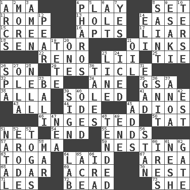 ACROSS 1. Housemaid (var.) 4. Shaw product 8. Arrange properly for use 11. Frolic 13. Opening into or through something 14. Comfort 15. Algonquian 16. Tenement units (abbr.) 17. One who doesn't tell the truth 18. Elected representative 21. Pig sounds 22. Former U.S. Attorney General Janet 23. Cards in a Roman deck? 25. Standoff 26. Male child 29. A testis 32. Cadet 34. One (Scot) 35. Girls' org. (abbr.) 38. Silent film actress Nazimova 39. Having a sole or soles 41. Singer Murray 43. Everything 44. Binary compound 45. Goodbye (Sp.) 46. Consumed 50. Make lace 51. Fish or hair follower 54. Conclude 55. Extremities 57. Odor 59. Inhabiting a nest 63. Ancient Roman robe 64. Put down 67. Type of rug 68. The sixth month of the Jewish calendar 69. Measure of real estate 70. Egg locale 71. French article 72. Necklace unit 73. A female animal or person DOWN 1. Curves 2. Greater amount 3. So be it 4. N Egypt peninsula 5. Chop off 6. The first octave above the treble staff 7. It is so 8. Inhabitant of Heaven 9. 1973 Nobel Price Winner (Physics) Leo 10. Laconic 12. Lightbulb-shaped fruit 14. Connecticut Ivy Leaguer 19. False hair 20. Single 21. Lubricate 23. Actor's bit 24. On the rocks 26. Health resort 27. Rounded earthenware pot or jar 28. 1994 drama film starring Jodie Foster 30. Stories 31. Mild oath 33. Indonesian resort city 36. In a ____ (agitated or irritated) 37. Small Philippine buffalo 39. Public display of a written message 40. Wrote a lyric poem 42. Eastern Standard Time (abbr.) 45. Does sums 47. Teachers' org. 48. Looked after 49. Compass dir. 51. Brizilian seaport 52. Wear away 53. Ancient Roman robes 56. Comedian Laurel of Laurel & Hardy 58. Third mo. 60. Angers 61. Soft 62. Yard entry 64. Experiment locale 65. Adept person 66. Retirement account (abbr.)