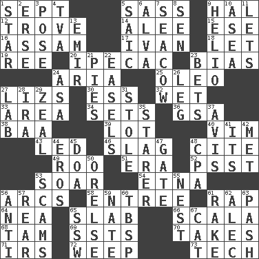 ACROSS 1. Back-to-school mo. 5. Backtalk 9. Actor Linden 12. Collection of objects 14. Toward shelter 15. Compass dir. 16. Indian state 17. "Terrible" tsar 18. Allow 19. Portuguese money of account (variant) 20. Medicinal drug used to evoke vomiting 23. Prejudice 24. Operatic vocal solo 25. Butter sub 27. Belonging to Elizabeth 30. Curvy letter 32. Dripping 33. Type of rug 34. Arranges properly for use 36. Girls' org. (abbr.) 38. Sound made by sheep 39. Car dealer's back yard 40. Zeal 43. Directed 46. Volcanic refuse 48. Quote 49. Friend of Pooh 51. Epoch 52. Inconspicuous attention getter 53. Fly high 54. Inactive volcano in Sicily 56. Arches 58. Main course 61. Reproach for some lapse or misdeed 64. Teachers' org. 65. Broad, flat, thick piece 66. Any of the three canals of the cochlea 68. Scottish cap 69. Fast planes 70. Receives possession of 71. Big collection agency 72. Shed a tear 73. Technician DOWN 1. Play the lead 2. Celtic language 3. Airs 4. Federal power corp. 5. Ketch in the Levant 6. Inventor's middle name 7. Manatee 8. Elected rep. 9. Sun: prefix 10. At sea 11. Allows 13. Arab leader 21. Sliced desserts 22. Artist's stands 23. Stakes 24. White ___ sheet 26. Part of a journey 27. Experiment locale 28. Lyricist Gershwin 29. Ardor 31. Took without asking 35. A viewer who gazes fixedly 37. Deliberation 41. It is 42. Was introduced to 44. Greek god of love 45. ___ good deed 47. Yard entry 48. Numbers guy (abbr.) 50. Threatening words 53. Fraudulent business schemes 55. Egg locale 56. Opposed to 57. Stern 59. Nathan's nickname 60. Cook's measure (abbr.) 61. Libertine 62. Actor Baldwin 63. Romantic infatuation 65. Compass dir. 67. Feline