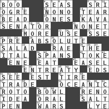ACROSS 1. Oct. 31 cry 4. Oceans 8. _ Lanka 11. Legendary monster 13. Words to Nanette 14. Rend 15. Necklace unit 16. Singles 17. Polynesian shrub of the pepper family 18. Legislator 21. Music written for nine 22. Greater amount 23. Purpose 25. Compass dir. 26. Before (prefix) 29. Utter; complete 32. Vegetable dish 34. Actress Charlotte 35. Definite Article 38. Slanted text style (abbr.) 39. Connects, as a bridge 41. Casino tip 43. Compass dir. 44. Erode 45. Artist's stand 46. Plea 50. Begley and Asner 51. Observe 54. Eastern Standard Time (abbr.) 55. Become fatigued 57. Swap 59. Pertaining to the sea 63. Printing process, for short 64. Soup holder 67. Western Nevada city 68. The content of cognition 69. Relating to the mouth 70. Table seasoning 71. Writing instrument 72. Armed conflicts 73. Sodium hydroxide DOWN 1. Moves up and down 2. Double curve, resembling the letter S 3. Northwest Algerian city 4. Sounds asleep 5. Period of immesurable duration 6. One (Scot) 7. Mayday 8. Seines 9. All-night dance parties 10. Feeling or showing extreme anger 12. Dutch treat 14. Ring climax 19. Frog relative 20. Globe 21. Remaining after all deductions 23. Uhlan (variant) 24. Institutes legal proceedings 26. Air pressure measure (abbr.) 27. Pace 28. Style 30. Declaim 31. Singer James 33. Toward shelter 36. Stockings 37. Supplemented with great effort 39. Arranges properly for use 40. Component 42. Raised railways 45. Jane of fiction 47. Born 48. Ringlike coral islands and reefs 49. Nervous spasm 51. Long narrow piece of something 52. Eat (away) 53. Ingested 56. Hearing organs 58. ___ good deed 60. Actress Patricia 61. In an inward manner 62. ____ d'Azur (French Riviera) 64. Ribbon knot 65. Mouth or opening 66. Armed conflict