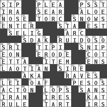 ACROSS 1. Small drink 4. Entreaty 8. Inconspicuous attention getter 12. Lyricist Gershwin 13. Dry up 14. Medicinal plant 15. Sense of smell 17. Torque (variant) 18. Overwhelms 19. Keyboard key 21. R.R. building 23. Eastern Standard Time (abbr.) 24. Major League Baseball Commissioner Bud 26. Curve 28. Neighbor of Neb. 30. Noisy, rowdy, vocal (Spanish) 34. Indian title of respect (Mr.) 37. Native american tent (variation) 39. Sever or remove by pinching or nipping 40. Period of immesurable duration 41. Eat (away) 43. Small bed 44. Singer James 46. A whole individual unit 47. Followers of ems 48. Of or relating to Laos or its people 51. Title for a man of rank and authority 54. Alias (abbr.) 55. All-night dance parties 58. Flowery wreath 61. Clumsy lout 63. Mexican monetary units 65. NE Massachussets city 67. Chops off 71. Without 72. SW Asia republic 73. Angers 74. Krazy ___ of comics 75. Governing power 76. Small pie 77. Big collection agency DOWN 1. Trig term 2. Metal shackles 3. Thick mixture 4. Pacific Standard Time (abbr.) 5. Lion 6. Ewer handle 7. Arches 8. Baking dish 9. A type of plum 10. Sty mamas 11. Trial 16. Snakelike fish 18. Indian skirt 20. To free from 22. The 19th letter of the Greek alphabet 25. Yard entry 27. Music discs 29. Japanese brewing company 30. Amusement-park features 31. Single time 32. The Jewish people; Israel 33. Chooses 34. Stitch closed the eyes of (a falcon) 35. Roll call or roster of names 36. To the inside or interior of 38. Plant holder 42. Arab leader 45. _ moment's notice (2 wds.) 49. Visual representation of an object 50. American Automobile Association (abbr.) 52. Hit sharply and swiftly 53. Nights before holidays 56. 1973 Nobel Price Winner (Physics) Leo 57. Underwater navigation system 58. Den 59. Shade of tan 60. Slanted text style (abbr.) 62. Secret move to avoid paying debts 64. Fast planes 66. Single 68. Mouth or opening 69. For each 70. Fast jet (abbr.)