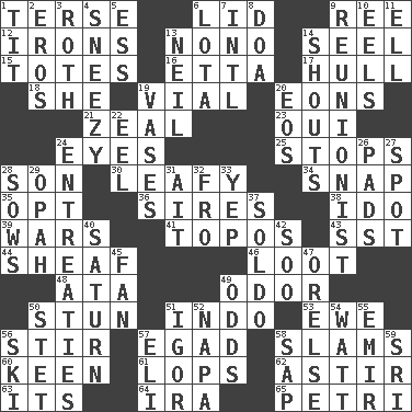 ACROSS 1. Laconic 6. Flaplike covering 9. Portuguese money of account (variant) 12. Removes the wrinkles 13. Words to Nanette 14. Stitch closed the eyes of (a falcon) 15. Lugs 16. Singer James 17. Frame or body of a ship 18. A female animal or person 19. Small bottle 20. Immeasurably long periods of time 21. Ardor 23. Fr. "Yes" 24. Snake ____ (dice throw) 25. Discontinues 28. Male offspring 30. Like summer trees 34. Fastener 35. Elect 36. Fathers 38. Wedding promise 39. Armed conflicts 41. Traditional theme or motif 43. Fast jet (abbr.) 44. To gather and bind into a bundle 46. Plunder 48. "One Day ___ Time" 49. Aroma 50. Make senseless or dizzy 51. Southeast Asian peninsula 53. She-sheep 56. Move through with a circular motion 57. Mild oath 58. Criticizes harshly 60. Peachy ____! 61. Chops off 62. Moving about 63. It is 64. Retirement account (abbr.) 65. _ dish (used to culture cells) DOWN 1. Teat (slang) 2. Greek god of love 3. Writer of Portnoy's Complaint (1969) 4. Dwarf with a sinus problem 5. Double-curved letter 6. Globular water bottle used in Asia 7. International (abbr.) 8. ___ good deed 9. One who advocates reunion 10. Snakelike fish 11. Pipe bend 13. Famous astronaut Armstrong 14. Yells 19. Flower holders 20. Greek goddess of the dawn 22. Snakelike fish 24. Pleas 26. Groovy apts. 27. Specific locale 28. Sty mamas 29. Brightly colored fish 31. Small island 32. Back 33. Slangy assent 37. Twentieth part of a lira 40. Titan orbits this 42. "Barney Miller" actor Jack 45. Avid follower 47. Threatening words 49. Probability 50. Proofreading order 51. Russian composer Stravinsky 52. California wine valley 54. Electrical Unit 55. Independent ruler or chieftain 56. What Jean-Claude Killy likes to do 57. Connecticut Ivy Leaguer 58. Plant excrement 59. _ Lanka