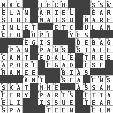 ACROSS 1. Apple computer (short form) 4. Technician 8. Compass dir. 11. Style 13. Satellite of Uranus 15. Hearing organ 16. Male parent of an animal 17. Taiwanese island in East China Sea 18. Female horse 19. An arm off of a larger body of water 21. And so on (abbr.) 22. ____ Bator, Mongolia 23. Corporate head (abbr.) 24. Choose 27. It is so 29. Armor plate that protects the chest 30. Debunk (Brit. slang) 34. Baking dish 36. Zero-star reviews 39. Showing deterioration from age 40. Patter 41. Peak District village in England 43. Relationship diagram 44. To the left, to Queeg 46. Mild oath 47. Compass dir. 48. Indian princess (variant) 49. Prejudice 51. Black tropical American cuckoo 53. Ocean 54. Followers of ems 57. Three-handed card game 60. Madame (abbr.) 63. Indian state 65. Suggestive of the supernatural 66. Pieces 69. Singer James 70. Biblical high priest 71. Come out of 72. Lacerate 73. Health resort 74. Adolescent 75. Shade tree DOWN 1. Mesonic 2. Place in a line 3. Monte _, Las Vegas Hotel/Casino 4. Scottish cap 5. Epoch 6. Quote 7. Command 8. Lick closed 9. "Two Mules for Sister ____" 10. Songbird 12. Born 14. "I Love _" 18. French bagpipes 20. Coat; cloak 25. Corncob 26. Sadhe (variant) 28. Begley and Asner 29. Plea 31. Soap units 32. Toward shelter 33. Unit of force equal to gravity 34. Dad 35. Soon (poet.) 37. Tired old horse 38. Thick slices 40. 4-wheeled motor vehicle 42. Singer Brickell 45. "___ Little Indians" 50. Auto club (abbr.) 52. Body of Kaffir warriors 54. First name in cosmetics 55. Relating to or accompanying birth 56. Excessive but superficial compliments 57. Perceives with the eye 58. Seaweed 59. Roberta Peters solo 61. Vertical spar for supporting sails 62. Celtic language 64. Put into a specified state 67. Third day of the wk. 68. Elected rep.