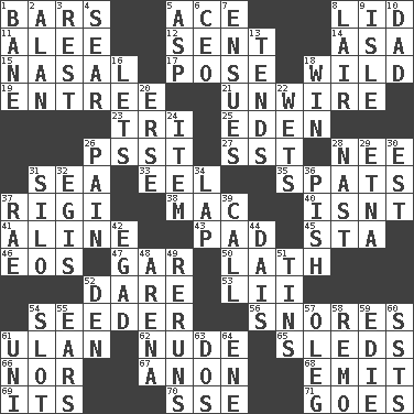 ACROSS 1. Drinking establishments 5. Adept person 8. Flaplike covering 11. Toward shelter 12. Transmitted 14. White ___ sheet 15. Rhinal 17. Airs 18. Uncontrolled 19. Main course 21. Undo the wiring of 23. Three (prefix) 25. Genesis locale 26. Inconspicuous attention getter 27. Fast jet (abbr.) 28. Born 31. Ocean 33. Snakelike fish 35. Arguments over trivial matters 37. Swiss mountan, "Queen of the Mountains" 38. Big _ 40. Is not 41. Place in a line 43. Writing tablet 45. R.R. building 46. Greek goddess of the dawn 47. Slender fish 50. Thin strip of wood or metal 52. Have the gumption 53. Cards in a Roman deck? 54. Sowing specialist 56. Sounds asleep 61. Uhlan (variant) 62. Unadorned 65. Bobsleighs 66. Not either 67. Soon (poet.) 68. Give off 69. ___ a Wonderful Life 70. Compass dir. 71. Leaves DOWN 1. Object of repulsion 2. Actor Alda or Thicke 3. Repose 4. Singe 5. Cleo's killer 6. Corporate head (abbr.) 7. Follows as a consequence or result 8. Den 9. Capri or Wight 10. June honoree 13. Is inclined (to) 16. Allows 18. Acquire through effort 20. Celtic language 22. Soaks 24. A whole individual unit 26. Ache 28. Political cartoonist Thomas 29. Inactive volcano in Sicily 30. Eastern Standard Time (abbr.) 31. Grain storage tower 32. Armor plate that protects the chest 34. Pet locale 36. Expression of disdain 37. Actress Charlotte 39. Give a ring to 42. Mild oath 44. Raised platform 48. Sports stadium 49. Summer TV shows 51. Airtight sealed metal containers 52. Lair 54. Notch 55. Hearing organs 57. Cassini of fashion 58. San ____ (Riviera town) 59. Singer Brickell 60. Fast planes 61. Corn or form start 63. Two (Sp.) 64. Compass dir.