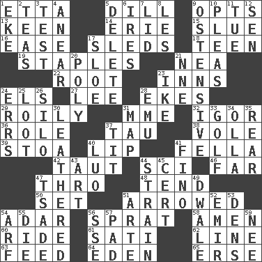 ACROSS 1. Singer James 5. Deli pickle 9. Chooses 13. Peachy ____! 14. One of the Great Lakes 15. Change direction abruptly 16. Comfort 17. Bobsleighs 18. Adolescent 19. Paper fasteners 21. Teachers' org. 22. Carrot, for example 23. Taverns 24. Raised railways 27. Area sheltered from the wind 28. Makes supply last 29. Agitated, as a liquid 31. Madame (abbr.) 32. Russian composer Stravinsky 36. Hero or heavy, e.g. 37. The 19th letter of the Greek alphabet 38. Grand slam 39. Portico 40. Mouth edge 41. Chap (slang) 42. Drawn tight 44. _-fi 46. At a great distance 47. Through, poetically 48. Be inclined (to) 50. Put into a specified state 51. Moved like an arrow 54. The sixth month of the Jewish calendar 56. Small fatty European fish 58. So be it 60. Travel on an animal 61. Suttee (variant) 62. Actor's bit 63. Nourish 64. Paradise 65. Celtic language DOWN 1. Supplement with great effort 2. Beverages made from leaves 3. Trial 4. Approach 5. Erase 6. Angers 7. Hat (slang) 8. French article 9. Clearly or manifestly demonstrative 10. Entreaties 11. Third day of the wk. 12. Elected rep. 17. _ gin 20. Many (prefix) 21. Compass dir. 23. Mamie's husband 24. Blunders 25. Spoils 26. Grain storage tower 28. Australian flightless bird 30. Resembling or made to resemble leather 31. Atlas unit 33. _ course 34. Rounded earthenware pot or jar 35. Hitchcock's "____ Window" 37. Teat (slang) 40. Nilotic language 41. Fine (Spanish) 43. Nonscientific branch of learning 44. Put through a sieve 45. Certainty 47. Sadhe (variant) 49. A sleeping potion; an opiate (poet.) 51. Johnson of "Laugh-In" 52. Arab leader 53. Lairs 54. Sandy's bark 55. Pass on 56. Compass dir. 57. Groovy apt. 59. Born