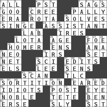 ACROSS 1. 100% 4. Pacific Standard Time (abbr.) 7. Sinks 11. Thick or sticky substance 12. Algonquian 13. Chummy 14. Epoch 15. Roll call or roster of names 16. Finds the solution 17. Scorch 19. Helper 21. Experiment locale 23. Angers 24. Globular water bottle used in Asia 25. Mature 26. Enemy 29. Baseball hit which scores a run 30. Followers of ems 31. Santa ___, CA 32. Modern: prefix 33. Big collection agency 34. Arrange properly for use 35. Remaining after all deductions 36. _-fi 37. Prepares for publication 40. Raised railways 41. Area sheltered from the wind 42. Elected reps. 43. Glance over 45. Affectionate concern, for short 46. Making a chance decision by using lots 51. Having ears or earlike features 55. Foolish or stupid persons 56. Mail 58. Sight organ 59. Impressive in appearance 60. Wig 61. Benjamin's nick name 62. Celtic language 63. Insidious 64. Fast jet (abbr.) DOWN 1. Eons 2. Australian parrot (variant) 3. Grant temporary use of 4. Adept person 5. Stalk of a moss capsule 6. Beverages made from leaves 7. Table seasonings 8. Inventor's middle name 9. Small, secluded valley 10. System (abbr.) 12. Make 13. Airs 16. Male parents of animals 18. Take by theft 20. Public displays of written messages 22. Drinking establishment 24. Plunders 25. Nest on high 26. Goes without food and/or water 27. Washington bills 28. Consume 29. Person who is morally reprehensible 32. Compass dir. 33. Ancient Celtic tribe of eastern Britain 36. Narrow boards 37. Eastern Standard Time (abbr.) 38. Keyboard key 39. South American Indian 43. Fur scarf 44. Quote 46. Trig term 47. Aroma 48. Chest bones 49. Elects 50. Christmas carol 52. Confederate soldiers (slang) 53. Snake ____ (dice throw) 54. Undesirable depression on a surface 57. Filthy place