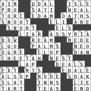 ACROSS 1. Direct toward a target or goal 4. Hereditary estate 8. Capri or Wight 12. Adept person 13. Suttee (variant) 14. Actress Patricia 15. Torque (variant) 17. Dutch treat 18. Expletives 19. Snob 21. Biblical high priest 23. "We ___ not amused" (Victoria) 24. Derisive sound 26. Raised railways 28. One who doesn't tell the truth 30. Nineveh was its capital 34. Arrow shooter 37. 480, 500 or 516 sheets of paper 39. Ancient Persian 40. Nilotic language 41. Insides of hands 43. Modern: prefix 44. Legendary monster 46. Hoof sound 47. One of the 12 tribes of Israel 48. Leopard's kin 51. Egg locale 54. Infant locale 55. Allots cards 58. Erode 61. Mountains (abbr.) 63. Peak District village in England 65. Columnist Joseph or Stewart 67. Method 71. Neighbor of Neb. 72. Narrow board 73. Restaurants 74. Whopper 75. Small pie 76. Afternoon social gatherings 77. Conclusion DOWN 1. Tenement units (abbr.) 2. Metal shackles 3. Person of subnormal intelligence 4. Purpose 5. Male parent 6. _ moment's notice (2 wds.) 7. Citrus frut 8. _ tizzy (2 wds.) 9. Bristle 10. Cowardly lion portrayer 11. Otherwise 16. Calm and collected 18. Lubricates 20. Three (prefix) 22. French article 25. Canvas cover 27. Symbol (abbr.) 29. Arrive at 30. ID or VA city 31. Tear apart 32. It may be bright or harebrained 33. Period of immesurable duration 34. Group of countries in special alliance 35. Ending for "Through" and "Enough" 36. Had on 38. 100% 42. Hurried 45. Snakelike fish 49. Pack (down) 50. Fitting 52. Perceive with the eye 53. Small boys 56. Dipping utensil 57. Killed 58. Compass direction 59. Silent film actress Nazimova 60. Russian ruler of old 62. Stricken, poetically 64. Supplemented with great effort 66. Baseball player Mel 68. Single 69. Heredity factor (abbr.) 70. Double-curved letter