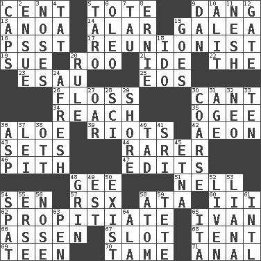 ACROSS 1. Penny 5. Carryall 9. Mild oath, euphamism for damn 13. Small Philippine buffalo 14. Having or resembling wings 15. An organ shaped like a helmet 16. Inconspicuous attention getter 17. One who advocates reunion 19. Institute legal proceedings 20. Friend of Pooh 21. Binary compound 22. Definite Article 23. He sold his birthright 25. Greek goddess of the dawn 26. Soft thread for cleaning between teeth 30. Patter 34. Arrive at 35. Double curve, resembling the letter S 36. _ vera 39. Debaucheries 42. Period of immesurable duration 43. Puts into a specified state 44. Less widely known 46. Essential or central part 47. Proofreads 48. Unit of force equal to gravity 51. 1994 drama film starring Jodie Foster 54. Elected rep. 57. Acura sports coupe 58. _ moment's notice (2 wds.) 60. One more than two 62. Appease 65. "Terrible" tsar 66. NE Netherlands city 67. Position in a hierarchy or organization 68. Portable shelter 69. Adolescent 70. Docile 71. Of or related to the anus DOWN 1. Balmoral and tarboosh 2. Follow as a consequence or result 3. Olfactory organs 4. Make lace 5. Pacific island yam 6. Margarine 7. The 19th letter of the Greek alphabet 8. Bert's buddy 9. Daniel's nick name 10. Set down 11. Delicate 12. Yard entry 15. Leaves 18. Wedding promise 20. Governing power 24. Anew 27. Boat paddle 28. _-fi 29. Dinah or Pauly 30. Rough 31. Personal question 32. Modern: prefix 33. "___ Little Indians" 36. Cleo's killer 37. Flowery wreath 38. Baseball player Mel 40. Small amount or degree 41. Indian title of respect (Mr.) 45. Inactive volcano in Sicily 48. Smile widely 49. Eastern Standard Time (abbr.) 50. Have an existence 52. Make or become more lively 53. Woody, climbing, usually tropical plant 54. Petty quarrel 55. Celtic language 56. Characteristic smell of wine 58. Tiny particle 59. False hair 61. International (abbr.) 63. Animal enclosure 64. Chicken ___ king 65. Call ___ day