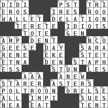 ACROSS 1. "You Light Up My Life" star Conn 5. Pacific Standard Time (abbr.) 8. Three (prefix) 11. Greek god of love 12. Angers 13. Friend of Pooh 14. Place for singles 17. Accusation by an informer 19. Cylindrical with tapered ends 21. Foolish or stupid persons 22. Carry 23. Commissioned military rank (abbr.) 24. Electrical Unit 27. Undesirable depression on a surface 29. Non-commissioned officer (abbr.) 32. Honkers 34. 24 hours 36. "Two Mules for Sister ____" 37. French philosopher Descartes 38. Make supply last 39. Proofreading order 40. Inactive volcano in Sicily 41. Lair 42. Staphylococcus 43. Double-curved letter 44. Surprise greatly 46. French article 47. American Automobile Association (abbr.) 50. Afresh 52. A viewer who gazes fixedly 55. Michaelmas daisies 57. Characterized by complete cowardliness 59. Threatening words 62. 100% 63. Body of Kaffir warriors 64. Takes to court 65. Teachers' org. 66. Erode 67. Portable shelter DOWN 1. Morning condensation 2. Retirement account (abbr.) 3. Stupid person 4. Small island 5. Before (prefix) 6. Former Milwaukee Brewers owner Bud 7. Sadhe (variant) 8. Musical group of three 9. Carrot, for example 10. Charged atoms 12. Binary compound 15. Eat (away) 16. Wig 18. Shallow baking pan 20. Looked after 24. Match 25. Confronts 26. Actor Sean's family 28. Receives possession of 29. Relating to or accompanying birth 30. Streamer paper 31. Expletives 33. Ocean 35. Gossips 36. Fast jet (abbr.) 42. Contemptuous expression 45. To (old English) 47. Tate display 48. Nest on high 49. Odor 51. Take or capture by force 52. Connect, as a bridge 53. Lacquered or enameled metalware 54. Silent film actress Nazimova 55. Cuckoo 56. Change direction abruptly 58. Choose 60. Elected rep. 61. Eastern Standard Time (abbr.)
