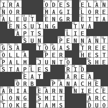 ACROSS 1. Lyricist Gershwin 4. Lyric poems 8. Liveliness 12. And not 13. Wise men 14. Old wives' tales, e.g. 15. Eskimo relative 18. Engineer (abbr.) 19. Singer James 20. Following as a consequence or result 22. Federal power corp. 23. Tenement units (abbr.) 24. Falsehood 25. Player for Phoenix 26. Pre-World Series prize 30. Girls' org. (abbr.) 33. Ancient Roman robes 36. Relationship diagram 37. Rounded earthenware pot or jar 39. For each 40. Command 41. Inside of hand 42. Secret group 44. A female animal or person 45. Paper fasteners 47. To free from 50. Erode 51. Type of rug 53. Globe 54. Flamboyance 57. Roberta Peters solo 59. Merit 61. Sibling's daughter 63. Protracted 64. Stricken, poetically 65. Curve 66. Puff or smoke 67. Scottish caps 68. Superhero pair DOWN 1. _ tizzy (2 wds.) 2. Hero or heavy, e.g. 3. Sports stadium 4. Sign of things to come 5. Mild oath, euphamism for damn 6. Ovum 7. Title for a knight 8. Veterans Day date 9. Globular water bottle used in Asia 10. Nonscientific branch of learning 11. Teachers' org. 16. United States Postal Service (abbr.) 17. Ballerina skirt 21. Is not 22. Shallow baking pan 24. French article 26. Piece 27. Ancient Greek god of war 28. Soft 29. Wig 30. Republicans 31. Narrow board 32. Silent film actress Nazimova 34. Musical composition 35. Commissioned military rank (abbr.) 38. Electrical Measurement 42. Passenger plane 43. Northwest Algerian city 46. Experiment locale 48. SW Asia republic 49. Tenth: prefix 52. Toward the future 53. Pig sound 54. Demure 55. Pismires 56. Shade of tan 57. The first octave above the treble staff 58. Friend of Pooh 59. Eastern Standard Time (abbr.) 60. Housemaid (var.) 62. Environmental prefix