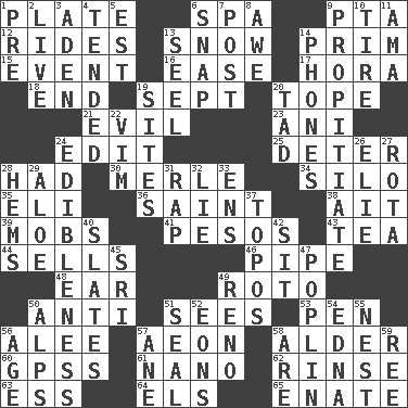 ACROSS 1. Food holder 6. Health resort 9. Parent Teacher Association (abbr.) 12. Amusement-park features 13. Overwhelm 14. Demure 15. Happening 16. Relaxation 17. Israeli folk dance 18. Conclude 19. Back-to-school mo. 20. Drink excessively 21. Tending to cause great harm 23. Cuckoo 24. Prepare for publication 25. Prevent from occurring 28. Possessed 30. Haggard of country music 34. Grain storage tower 35. Biblical high priest 36. Inhabitant of Heaven 38. Small island 39. Disorderly crowds 41. Mexican monetary units 43. Afternoon social gathering 44. Exchanges for money 46. Corncob 48. Hearing organ 49. Printing process, for short 50. Against 51. Observes 53. Animal enclosure 56. Toward shelter 57. A really long time 58. Tree or shrub in the Birch family 60. Global Positioning Systems (abbr.) 61. Billionth: prefix 62. Remove soap 63. Double-curved letter 64. Raised railways 65. Maternal DOWN 1. Before (prefix) 2. Moving, as bait 3. Arabian gulf 4. Watched over 5. Eastern Standard Time (abbr.) 6. Fastener 7. Mail 8. Deep reverence 9. Conciliate 10. Become fatigued 11. Nursemaid (var.) 13. Stitch closed the eyes of (a falcon) 14. Gives a jingle 19. Settings 20. Bit 22. Zeal 24. The property of being fit to eat 26. Writer Wiesel 27. Round or rotation of duties 28. Equivocates 29. Medicinal plant 31. Reproach for some lapse or misdeed 32. Whopper 33. Followers of ems 37. Traditional theme or motif 40. Chalkboards 42. Be seated 45. Indian title of respect (Mr.) 47. Cotton for raincoats, e.g. 49. Former U.S. Attorney General Janet 50. High mountains 51. Lick closed 52. Immeasurably long periods of time 54. Pulitzer Prize-winning author Ferber 55. A home for chicks 56. Ripen 57. One (Scot) 58. "We ___ not amused" (Victoria) 59. Portuguese money of account (variant)
