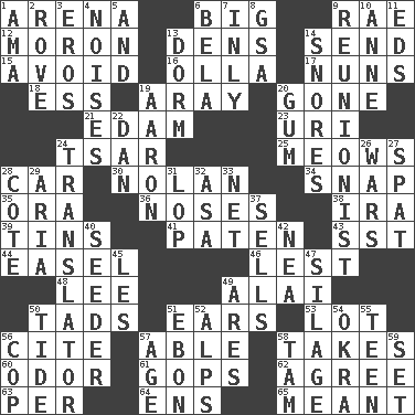 ACROSS 1. Sports stadium 6. Large 9. Actress Charlotte 12. Person of subnormal intelligence 13. Cub Scout units 14. Transmit 15. Prevent from happening 16. Water jar 17. Religious women 18. Double-curved letter 19. Like ___ of sunshine 20. Went 21. Dutch treat 23. RI univ. 24. Russian ruler of old 25. Catcalls? 28. 4-wheeled motor vehicle 30. Pitcher Ryan 34. Fastener 35. Mouth or opening 36. Olfactory organs 38. Retirement account (abbr.) 39. Metal containers 41. Eucharist need 43. Fast jet (abbr.) 44. Artist's stand 46. For fear that 48. Area sheltered from the wind 49. Jai ____ 50. Small boys 51. Hearing organs 53. Car dealer's back yard 56. Quote 57. Competent 58. Receives possession of 60. Scent 61. Republicans 62. Match 63. For each 64. Followers of ems 65. Intended DOWN 1. Wet nurse (var.) 2. Be footloose 3. Greek god of love 4. Annoying sounds 5. Also 6. Actor Lugosi 7. In an inward manner 8. Girls' org. (abbr.) 9. One who advocates reunion 10. Singer Murray 11. Begley and Asner 13. Dormintory (informal) 14. Sounds asleep 19. Composer Copland 20. Chewing product 22. Daniel's nick name 24. Interpreter 26. Armed conflicts 27. Argument over a trivial matter 28. ____ d'Azur (French Riviera) 29. Roberta Peters solo 31. Chop off 32. White ___ sheet 33. Fish or hair follower 37. Exchanges for money 40. Sowing specialist 42. Teachers' org. 45. French article 47. Fodder prepared in a silo 49. Ancient Greek god of war 50. Event that recurs at intervals 51. Inky black, to poets 52. High mountains 54. Gumbo ingredient 55. Adolescent 56. Police officer (slang) 57. Grow older 58. Scottish cap 59. Put into a specified state