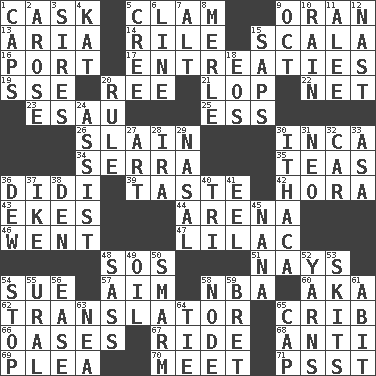 ACROSS 1. Keg 5. Dollar (slang) 9. NW Algerian seaport 13. Roberta Peters solo 14. Cause heat under the collar 15. Any of the three canals of the cochlea 16. Left side of a ship or aircraft 17. Pleas 19. Compass dir. 20. To sift 21. Trim (branches) 22. Fish or hair follower 23. Son of Isaac 25. Curvy letter 26. Killed 30. South American Indian 34. Spanish missionary in California 35. Beverages made from leaves 36. "You Light Up My Life" star Conn 39. Clothes sense 42. Israeli folk dance 43. Makes supply last 44. Sports stadium 46. Gone 47. Pale purple color 48. Distress signal 51. Negative votes 54. Institute legal proceedings 57. Direct toward a target or goal 58. Basketball assoc. 60. Alias (abbr.) 62. Interpreter 65. Baby bed with high sides 66. Fertile tracts in a desert 67. Travel on an animal 68. Opposed to 69. Entreaty 70. Confront 71. Inconspicuous attention getter DOWN 1. Smile enhancers 2. Came up 3. Male parents of animals 4. Krazy ___ of comics 5. Algonquian 6. Actor's bit 7. Keyboard modifier key 8. Haggard of country music 9. Sep. follower 10. Precipitation 11. Toward shelter 12. Political cartoonist Thomas 15. Plant excrements 18. Greek goddess of the dawn 20. General guideline 24. Help 27. Tate display 28. Lyricist Gershwin 29. Rhinal 30. New York city 31. Modern: prefix 32. 4-wheeled motor vehicle 33. White ___ sheet 36. Morning condensation 37. Mamie's mate 38. Lair 40. Three (prefix) 41. Snakelike fish 45. Grandmother 48. Backtalk 49. Petroleum 50. Excessive but superficial compliments 52. Tall tales 53. Burlesque acts 54. Obstruct or block passage 55. Mountain range 56. Relaxation 58. Thickened enlargement 59. Cy Young winner Saberhagen 61. "This won't hurt ____!" 63. Teachers' org. 64. Make a knot 65. Head covering