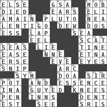 ACROSS 1. Otherwise 5. Girls' org. (abbr.) 8. Disorderly crowd 11. Passed on 12. Hearing organs 14. Biblical high priest 15. At full speed 17. Cartoon dog 18. Teachers' org. 19. Small, flat, pigmented spot on the skin 21. Morning condensation 22. Two (Sp.) 23. Double-curved letter 24. Infant locale 25. Ocean 27. Snakelike fish 28. Scram! 31. Oceans 35. Whopper 37. Prong on a fork 38. Relaxation 39. Compass dir. 41. Inactive volcano in Sicily 42. Celtic language 43. First lady 45. Sight organs 46. Clip 47. Curve 49. Symbol (abbr.) 51. ___ good deed 52. Title for a knight 55. Plant holder 57. Added to 60. Core 62. _ tizzy (2 wds.) 63. Secured 65. Leg joints 66. Fenced enclosure 67. Restaurants 68. Gouge 69. Eastern Standard Time (abbr.) 70. Perceive with the eye 71. Indian titles of respect DOWN 1. Peak District village in England 2. Citrus fruits 3. Actors Connery and Penn 4. Prepare for publication 5. Set 6. Saudi Arabian king (1953-1964) 7. Johnson of "Laugh-In" 8. Ananias' fault 9. Butter sub 10. Prejudice 13. Sty mamas 16. The longest river in the world 17. Cotton for raincoats, e.g. 20. Highlander 26. First name in cosmetics 29. Queen of England 1702-14 30. Afternoon social gatherings 31. Observes 32. Merit 33. Aide 34. Oozy 36. Compass dir. 40. Eluded 44. Greek god of love 48. Keg 50. Wise men 52. Contemptuous expression 53. Ancient Celtic tribe of eastern Britain 54. Musical pauses 55. Corncob 56. Washington bills 58. Religious women 59. Unit of force 61. Extremities 64. Compass dir.