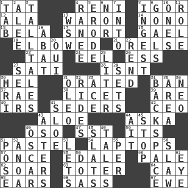 ACROSS 1. Make lace 4. Painter Guido (1575-1642) 8. Russian composer Stravinsky 12. Chicken ___ king 13. Make _____ (do battle with) 14. Words to Nanette 15. Actor Lugosi 17. Derisive sound 18. Highlander 19. Shoved, as through a crowd 21. Threatening words 23. The 19th letter of the Greek alphabet 24. Snakelike fish 26. Curvy letter 27. Suttee (variant) 28. Is not 30. Cartoonist voice _ Blanc 31. Declaimed 34. Bar 37. Actress Charlotte 38. It is permitted: Lat. 39. "We ___ not amused" (Victoria) 40. Big collection agency 41. Spring feasts 42. Corporate head (abbr.) 43. _ vera 44. "____ silly question..." 46. Bear (Spanish) 47. Fast jet (abbr.) 50. ___ a Wonderful Life 51. Soft color 54. Portable computers 57. Single time 58. Peak District village in England 60. Diluted with white 62. Fly high 63. Carrier 64. Island 65. Hearing organs 66. Backtalk 67. She-sheep DOWN 1. Keyboard key 2. Toward shelter 3. Baron Munchausen's specialties 4. The wife of a rajah (variant) 5. Wear away 6. And not 7. To the inside or interior of 8. Eat 9. Scores awarded for successful feats 10. Washington bills 11. Hero or heavy, e.g. 13. Compass dir. 16. Blind as ____ 20. Fr. "Yes" 22. Tear apart 25. 61 cubic inches 27. Wither 29. Arranges properly for use 30. Medical imaging device (abbr.) 31. Butter sub 32. Amusement-park features 33. Adept person 34. Keyboard key 35. Type of rug 36. Modern: prefix 41. _ gin 43. Michaelmas daisies 44. Small island 45. Discontinue 46. Motion picture award 48. Narrow boards 49. Falsehoods 51. Introduce or present, as a question 52. Small Philippine buffalo 53. Allows 55. For each 56. Cole _ (cabbage dish) 59. ___ good deed 61. Sight organ