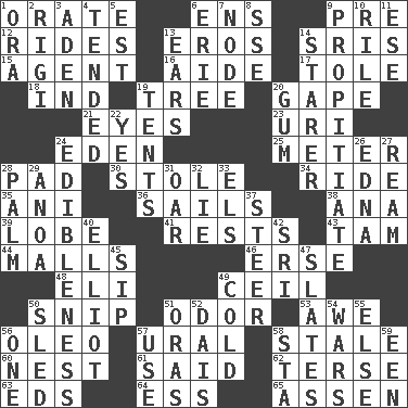 ACROSS 1. Declaim 6. Followers of ems 9. Before (prefix) 12. Amusement-park features 13. Greek god of love 14. Indian titles of respect 15. Representative 16. Assistant 17. Lacquered or enameled metalware 18. Indiana (abbr.) 19. Family _ (genealogy) 20. Open wide 21. Snake ____ (dice throw) 23. RI univ. 24. Genesis locale 25. Distance measurement 28. Groovy apt. 30. Fur scarf 34. Travel on an animal 35. Black tropical American cuckoo 36. Travels by water 38. Santa ___, CA 39. Ear part 41. Musical pauses 43. Scottish cap 44. Shopping centers 46. Celtic language 48. Connecticut Ivy Leaguer 49. To provide with a ceiling 50. Clip 51. Scent 53. Deep reverence 56. Margarine 57. Mountain range 58. Showing deterioration from age 60. Egg locale 61. Expressed in words 62. Laconic 63. Begley and Asner 64. Double-curved letter 65. NE Netherlands city DOWN 1. Mouth or opening 2. Swiss mountan, "Queen of the Mountains" 3. Arabian gulf 4. Watched over 5. Eastern Standard Time (abbr.) 6. 4th largest of the Great Lakes 7. Connecting point 8. Compass dir. 9. Conciliate 10. Cause heat under the collar 11. Compass dir. 13. Hearing organs 14. A viewer who gazes fixedly 19. Portable shelters 20. Chewing product 22. Consenting reply 24. The property of being fit to eat 26. Pulitzer Prize-winning author Ferber 27. 480, 500 or 516 sheets of paper 28. Inside of hand 29. Small Philippine buffalo 31. Boat paddle 32. Whopper 33. Raised railways 37. Navigate 40. American author Paul (1891-1958) 42. Indian title of respect (Mr.) 45. Small drink 47. Chalkboards 49. Chilled 50. Downhill vehicle 51. Mouths or openings 52. Raised platform 54. Armed conflicts 55. Otherwise 56. Single 57. Purpose 58. R.R. building 59. Car or cant ending