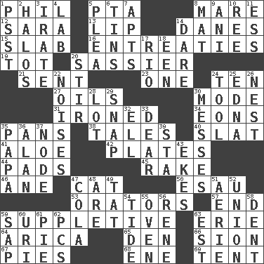 ACROSS 1. Silvers or Donahue 5. Parent Teacher Association (abbr.) 8. Female horse 12. "Two Mules for Sister ____" 13. Mouth edge 14. Natives or inhabitants of Denmark 15. Broad, flat, thick piece 16. Pleas 19. Small child 20. More lively and spirited 21. Emitted 23. Single 24. Nine, plus one 27. Petroleums 30. Method 31. Pressed 34. Immeasurably long periods of time 35. Zero-star reviews 38. Stories 40. Narrow board 41. Medicinal plant 42. Food holders 44. Writing tablets 45. Immoral or dissolute person 46. One (Scot) 47. Feline 50. He sold his birthright 53. Speakers 57. Conclusion 59. Supplying deficiencies 63. 4th largest of the Great Lakes 64. N. Chile seaport 65. Lair 66. The Jewish people; Israel 67. Sliced desserts 68. Compass dir. 69. Portable shelter DOWN 1. Inconspicuous attention getter 2. Saint headwear 3. Feeling or showing extreme anger 4. Experiment locale 5. Entreaty 6. Airtight sealed metal containers 7. Flats, for short 8. Floor covering 9. Black tropical American cuckoo 10. To riddle 11. Curvy letter 14. Have the gumption 17. River (Sp.) 18. Car or cant ending 20. Agitate 22. Annoying sounds 24. Utensil 25. Pulitzer Prize-winning author Ferber 26. Egg locale 28. Car dealer's back yard 29. Fastener 30. Makes clutter 32. Pipe bend 33. Letter starter 35. Dad 36. Actor Alda or Thicke 37. Connecting point 39. R.R. building 43. Makes supply last 47. Root beer relative 48. "We ___ not amused" (Victoria) 49. Make lace 51. Nest on high 52. The state of being joined or united 54. Periodic rise and fall of the sea level 55. Baking chamber 56. French philosopher Descartes 58. Gouge 59. Plant excrement 60. RI univ. 61. Sliced dessert 62. Personal Computers (abbr.) 63. Eastern Standard Time (abbr.)