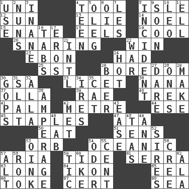 ACROSS 1. University (slang) 4. Instrument 8. Capri or Wight 12. Player for Phoenix 13. Writer Wiesel 14. Christmas carol 15. Maternal 18. Snakelike fish 19. Calm and collected 20. Catching in a trap 22. Victory 23. Inky black, to poets 24. Possessed 25. Fast jet (abbr.) 26. Mood resulting from idleness 30. Girls' org. (abbr.) 33. It is permitted: Lat. 36. Grandmother 37. Spanish pot 39. Actress Charlotte 40. Long journey 41. Inside of hand 42. Distance measurement (Brit.) 44. Compass dir. 45. Paper fasteners 47. _ moment's notice (2 wds.) 50. Consume 51. Elected reps. 53. Globe 54. Pertaining to the sea 57. Roberta Peters solo 59. Periodic rise and fall of the sea level 61. Father Junipero _ 63. Yearn 64. Visual representation of an object 65. Snakelike fish 66. Puff or smoke 67. Certainty 68. Ocean DOWN 1. Purpose 2. Religious women 3. Lacking in sense or substance 4. Adolescent 5. Cassini of fashion 6. Petroleum 7. French article 8. Happening 9. Within a short period 10. Lion 11. Pipe bend 16. Bar bills 17. Greek god of love 21. International (abbr.) 22. Armed conflict 24. Being at a high temperature 26. Fermented drink made from hops 27. Have the gumption 28. Singles 29. Create 30. Republicans 31. Narrow board 32. Silent film actress Nazimova 34. Angers 35. Domesticated feline 38. Electrical Measurement 42. Was introduced to 43. Relaxation 46. Experiment locale 48. Afternoon social gatherings 49. Queen of England 1702-14 52. Fathers 53. Pig sound 54. Aroma 55. Penny 56. Algonquian 57. The first octave above the treble staff 58. Friend of Pooh 59. Nervous spasm 60. Mamie's mate 62. According to