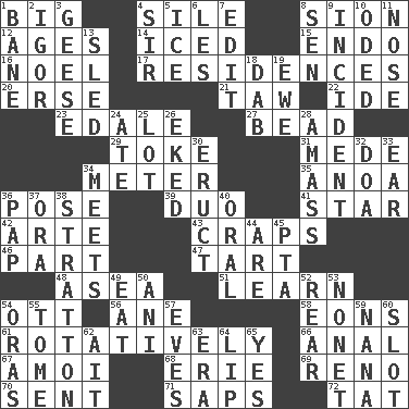 ACROSS 1. Large 4. Drop; flow; fall 8. The Jewish people; Israel 12. Eras 14. On the rocks 15. Inside; within (prefix) 16. Christmas carol 17. Homes 20. Celtic language 21. The 23rd letter of the Hebrew alphabet 22. Binary compound 23. Peak District village in England 27. Necklace unit 29. Casino tip 31. Ancient Persian 34. Distance measurement 35. Small Philippine buffalo 36. Airs 39. Superhero pair 41. Play the lead 42. Johnson of "Laugh-In" 43. Dice game 46. Component 47. Small pie 48. At sea 51. Memorize 54. Baseball player Mel 56. A saturated hydrocarbon 58. Immeasurably long periods of time 61. Rotating or pertaining to rotation 66. Of or related to the anus 67. Mine, in Marseilles 68. 4th largest of the Great Lakes 69. Western Nevada city 70. Transmitted 71. Plant excrements 72. Make lace DOWN 1. Object of repulsion 2. Russian composer Stravinsky 3. Honkers 4. Title for a knight 5. Frozen water 6. French article 7. Prepare for publication 8. Elected rep. 9. Happening 10. Wrote a lyric poem 11. Sense of smell 13. Downhill vehicle 18. Pat or tap gently 19. She-sheep 24. Had dinner 25. Car dealer's back yard 26. Made supply last 28. Collect or gather 30. Spew [out] 32. ___ good deed 33. Hearing organ 34. Confronts 36. Infant food 37. Mouth or opening 38. Ski resort town in Vermont 40. Relating to the mouth 44. "We ___ not amused" (Victoria) 45. Parent Teacher Assoc. 49. Consume 50. Black tropical American cuckoo 52. Hitchcock's "____ Window" 53. Music written for nine 54. Mouths or openings 55. Heavy book 57. Nights before holidays 59. Nanny 60. Position in a hierarchy or organization 62. Small island 63. Period 64. Mouth edge 65. It is so