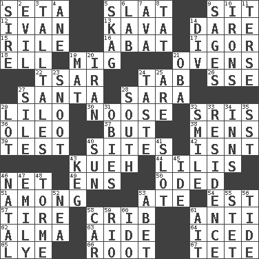 ACROSS 1. Bristle 5. Narrow board 9. Be seated 12. "Terrible" tsar 13. Polynesian shrub of the pepper family 14. Have the gumption 15. Cause heat under the collar 16. Blind as ____ 17. Composer Stravinsky 18. Pipe bend 19. Russian fighter aircraft 21. Baking chambers 22. Russian ruler of old 24. Bar bill 26. Compass dir. 27. Before Barbara or Clara 28. "Two Mules for Sister ____" 29. _ and Stitch 30. Trap for birds or small mammals 32. Indian titles of respect 36. Butter sub 37. On the contrary 38. Not women's 39. Trial 40. Settings 42. Is not 43. Malaysian steamed pastry 44. Ms. Damita and namesakes 46. Remaining after all deductions 49. Followers of ems 50. Wrote a lyric poem 51. Amid 53. Had dinner 54. Eastern Standard Time (abbr.) 57. Become fatigued 58. Baby bed with high sides 61. Against 62. _ mater 63. Helper 64. On the rocks 65. Sodium hydroxide 66. Carrot, for example 67. False hair DOWN 1. Beget 2. Morally bad or wrong 3. Baron Munchausen's specialties 4. One (Scot) 5. Heroin 6. Experiment locale 7. Actress Gardner 8. Make lace 9. Gurus 10. Removes the wrinkles 11. Laconic 14. HTML Container Element 19. Floor covering 20. SW Asia republic 21. Chief or king in Benin or Nigeria 23. Snout, nose 24. Clothes sense 25. "We ___ not amused" (Victoria) 27. Filth; sediment 28. 180 degrees 29. Car dealer's back yard 31. Off-Broadway awards 32. Grin 33. Dwelling 34. Taverns 35. Fast jet (abbr.) 40. Player for Phoenix 41. Groove 43. Cask 45. Binary compound 46. Relating to or accompanying birth 47. Poet Dickinson 48. Singer Mel 52. Teachers' org. 53. Collude with 55. Proofreading order 56. Event that recurs at intervals 58. 4-wheeled motor vehicle 59. River (Sp.) 60. Wedding promise 61. Small island