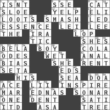 ACROSS 1. Is not 5. Compass dir. 8. Feline 11. _ gin 12. Sharp bark 14. Connecticut Ivy Leaguer 15. Plunders 17. Box-office sellout 18. Directed 19. Center 21. Luau accessory 22. Area sheltered from the wind 23. Definite Article 24. Lyricist Gershwin 25. Chop off 27. Nervous spasm 28. "______ My Girl" (Turtles hit) 31. Actor Lugosi 35. Male child 37. Root beer relative 38. Lyric poems 39. Soggy 41. Of or related to the anus 42. Prejudice 43. A female animal or person 45. Monthly bill 46. Bristle 47. Begley and Asner 49. Part of HMS, perhaps 51. Ocean 52. ___ good deed 55. Adept person 57. Cards in a Roman deck? 60. Stimulate to action 62. Make imperfect 63. Ferber et al. 65. Echolocation 66. Single 67. Gouge 68. Suttee (variant) 69. It would 70. White ___ sheet 71. Relationship diagram DOWN 1. Small island 2. Agitate, as a liquid 3. Trap for birds or small mammals 4. Wig 5. Symbol (abbr.) 6. Lick closed 7. Otherwise 8. Portable communications device 9. Toward shelter 10. Event that recurs at intervals 13. Silvers or Donahue 16. In a ____ (agitated or irritated) 17. Manatee 20. Baby bed with high sides 26. Witty Wilde 29. Liveliness 30. Table seasoning 31. Moves up and down 32. Singer Brickell 33. Tough but pliablecoriaceous 34. Slender Brazilian palm 36. Affirmative reply 40. College paper 44. Locale of original sin 48. Backtalk 50. Downhill vehicle 52. Middle Eastern gold or silver currency 53. Speak pompously 54. Nest on high 55. Mine, in Marseilles 56. Patter 58. The main thing one is thinking about 59. Taverns 61. Mail 64. "One Day ___ Time"