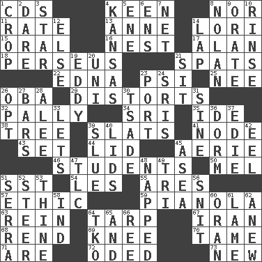 ACROSS 1. Music discs 4. Peachy ____! 8. Not either 11. Pace 13. Queen of England 1702-14 14. Australian parrot (variant) 15. Spoken 16. A home for chicks 17. ____ Jay Lerner 18. Son of Zeus who helped slay Medusa 21. Arguments over trivial matters 22. Pulitzer Prize-winning author Ferber 23. Air pressure measure (abbr.) 25. Born 26. Chief or king in Benin or Nigeria 29. What propaganda does 32. Chummy 34. _ Lanka 35. Binary compound 38. Relationship diagram 39. Narrow boards 41. Connecting point 43. Put into a specified state 44. Hat (slang) 45. Nest on high 46. SAT takers 50. Cartoonist voice _ Blanc 51. Fast jet (abbr.) 54. French article 55. Ancient Greek god of war 57. Principle of right and wrong 59. Player piano 63. It's straight from the horse's mouth 64. Canvas cover 67. SW Asia republic 68. Tear apart 69. Leg joint 70. Not wild 71. "We ___ not amused" (Victoria) 72. Wrote a lyric poem 73. ___ Haven, CT DOWN 1. Riding implement 2. Have the gumption 3. Play the lead 4. Sunflower state 5. Compass dir. 6. Followers of ems 7. Fish or hair follower 8. Pitcher Ryan 9. Declaim 10. Remove soap 12. Otherwise 14. Infant locale 19. Whirlpool 20. Single; one (prefix) 21. Be seated 23. Sweet dark-red dessert wine 24. Indian titles of respect 26. Elect 27. Soap units 28. Toward shelter 30. Sadhe (variant) 31. Trig term 33. Allows 36. Dormintory (informal) 37. Singer Brickell 39. Turn sharply 40. Hats (slang) 42. Snakelike fish 45. At sea 47. Affectionate concern, for short 48. Slept 49. Three (prefix) 51. Spanish missionary in California 52. Navigate 53. One or ones belonging to thee 56. In a ____ (agitated or irritated) 58. Indiana (abbr.) 60. NW Algerian seaport 61. Unable to walk 62. Afresh 64. Ring climax 65. Plus 66. To riddle