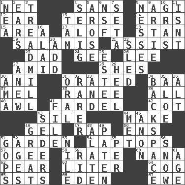 ACROSS 1. Remaining after all deductions 4. Without 8. Wise men 12. Ewer handle 13. Laconic 14. Blunders 15. Type of rug 17. At or to great height 18. Comedian Laurel of Laurel & Hardy 19. Deli grouping 21. Aid 23. Male parent 24. Turn to the right 26. Area sheltered from the wind 27. Among 28. "______ My Girl" (Turtles hit) 30. Black tropical American cuckoo 31. Declaimed 34. Sound made by sheep 37. Cartoonist voice _ Blanc 38. The wife of a rajah (variant) 39. 100% 40. Leather borer 41. Pack 42. Small bed 43. Filth; sediment 44. Create 46. Set 47. Strike 50. Followers of ems 51. Place where plants grow 54. Portable computers 57. Double curve, resembling the letter S 58. Feeling or showing extreme anger 60. Nanny 62. Lightbulb-shaped fruit 63. 61 cubic inches 64. Gear tooth 65. Fast planes 66. Genesis locale 67. She-sheep DOWN 1. Teachers' org. 2. Hearing organs 3. Excercise machine 4. Former Milwaukee Brewers owner Bud 5. Came up 6. Overdraft (abbr.) 7. Stalk of a moss capsule 8. Makes clutter 9. Nick name for Arthur 10. Pate de foie ____ 11. Is not 13. Scottish cap 16. Jai _ 20. Find the sum of 22. Downhill vehicle 25. First name in cosmetics 27. Afresh 29. Person who is morally reprehensible 30. Nanny (var.) 31. Relating to the mouth 32. Less widely known 33. Also 34. Keyboard key 35. _ vera 36. Keyboard modifier key 41. Do some clerical work 43. Spring feasts 44. Was introduced to 45. At once, immediately (arch.) 46. Relatively large 48. Having winglike extensions 49. Eucharist need 51. Republicans 52. Eons 53. The longest river in the world 55. For each 56. Overwhelm 59. To free from 61. Ripen