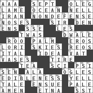 ACROSS 1. Auto club (abbr.) 4. Back-to-school mo. 8. Cassini of fashion 12. Unable to walk 14. Sea 16. 1994 drama film starring Jodie Foster 17. SW Asia republic 18. Unrelated to defense, as in spending 20. Olfactory organs 22. Title for a knight 23. Lair 24. Followers of ems 25. Compass dir. 28. French article 30. It was, poetically 31. A sleeping potion; an opiate (poet.) 35. Friend of Pooh 37. Inside of hand 40. Greek god of love 41. Australian parrot (variant) 42. Atmospheres 44. Vintage cars 45. Slanted text style (abbr.) 46. The content of cognition 47. Large container 48. Flower holders 50. Become fatigued 52. Beverage made from leaves 54. _-fi 55. Air pressure measure (abbr.) 58. Elected rep. 61. Chicken ___ king 63. Stares at amorously 65. The property of being fit to eat 70. Shout 71. Falsehood 72. Follow as a consequence or result 73. Diluted with white 74. So be it 75. Inactive volcano in Sicily 76. Fast jet (abbr.) DOWN 1. Place in a line 2. Composer Copland 3. Collect or gather 4. Manchild 5. Environmental prefix 6. Animal enclosure 7. Small amounts or degrees 8. Single 9. Grant temporary use of 10. Otherwise 11. Small, secluded valley 13. Compass dir. 15. Famous astronaut Armstrong 19. Flintstone 21. Compass dir. 26. Plant excrements 27. 1973 Nobel Price Winner (Physics) Leo 29. Turn aside suddenly 30. Bathroom plumbing fixture 32. Length times width 33. Spoils 34. Curvy letter 35. Round or rotation of duties 36. Mouths or openings 38. Hat (slang) 39. Confronts 41. 54 in ancient Rome 43. Ketch in the Levant 49. Lick closed 51. River (Sp.) 53. Toward shelter 55. Entreaties 56. Exchanges for money 57. Small island 58. Bristle 59. Dutch treat 60. The longest river in the world 62. Queen of England 1702-14 64. Swindle 66. Benjamin's nick name 67. Eastern Standard Time (abbr.) 68. Player for Phoenix 69. Ocean