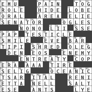 ACROSS 1. Australian flightless bird 4. Ache 8. Coat; cloak 11. Hero or heavy, e.g. 13. Flintstone garb 14. Ear part 15. Taken by mouth 16. Length times width 17. Writer Wiesel 18. Elected representative 21. Stares at amorously 22. Words to Nanette 23. Cards in a Roman deck? 25. Compass dir. 26. Infant food 29. A testis 32. Grin 34. Night before a holiday 35. Drinking establishment 38. Native american tent (variation) 39. Tear up 41. Cassini of fashion 43. Lair 44. Greek goddess of the dawn 45. Foe 46. Plea 50. Police officer (slang) 51. Epoch 54. American Automobile Association (abbr.) 55. Hoop that covers a wheel 57. Former Milwaukee Brewers owner Bud 59. Pertaining to the sea 63. Russian ruler of old 64. Slanted text style (abbr.) 67. Painter Guido (1575-1642) 68. Singer James 69. 1994 drama film starring Jodie Foster 70. Table seasoning 71. Compass dir. 72. Pismires 73. Potassium hydroxide DOWN 1. Greek god of love 2. Greater amount 3. ____ Bator 4. N Egypt peninsula 5. Wind 6. Binary compound 7. Teachers' org. 8. For Whom the Bell _____ 9. Off-Broadway awards 10. Honkers 12. Enthusiasm 14. Part of a journey 19. Haul 20. Single 21. Petroleum 23. Moving, as bait 24. On the rocks 26. Pacific Standard Time (abbr.) 27. Among 28. Corncob 30. Laconic 31. Inky black, to poets 33. Actor's bit 36. Actor Baldwin 37. San ____ (Riviera town) 39. Stalk of a moss capsule 40. Israeli folk dance 42. Con 45. Jane of fiction 47. Tired old horse 48. Ringlike coral islands and reefs 49. Nervous spasm 51. First name in cosmetics 52. Musical pauses 53. Having winglike extensions 56. Hearing organs 58. Lyricist Gershwin 60. Anneal 61. Inwardly 62. Quote 64. _ tizzy (2 wds.) 65. Nine, plus one 66. The first octave above the treble staff