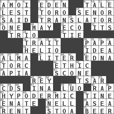 ACROSS 1. Mine, in Marseilles 5. Paradise 9. Lie 13. For fear that 14. "Corrida" creature 15. Sir (Sp.) 16. Alleged 17. Interpreter 19. Single 20. Can I? 21. Environmental prefix 22. ___ a Wonderful Life 23. Musical group of three 25. Standoff 26. Distinguishing feature 30. Dad 34. Sun: prefix 35. The content of cognition 36. _ mater 39. 61 cubic inches 42. Pulitzer Prize-winning author Ferber 43. Torque (variant) 44. Principle of right and wrong 46. Capital of Western Samoa 47. Biscuitlike quick bread 48. Marina Del _, California 51. Russian ruler of old 54. Music discs 57. _ tizzy (2 wds.) 58. Nilotic language 60. Hit sharply and swiftly 62. Below the epidermis 65. Prong on a fork 66. Maternal 67. 1994 drama film starring Jodie Foster 68. At sea 69. Monthly bill 70. Portico 71. Fermented drink made from hops DOWN 1. In addition 2. Intended 3. Flexible twig of a willow tree 4. It would 5. Singer James 6. Rowboat 7. Epoch 8. Music written for nine 9. Beverage made from leaves 10. Opposed to 11. Plunder 12. Blunders 15. A type of plum 18. _-fi 20. Greater amount 24. New York city 27. 100% 28. One more than two 29. Hauls 30. Components 31. Say or write further 32. Animal enclosure 33. Auto club (abbr.) 36. "One Day ___ Time" 37. Trim (branches) 38. Medical imaging device (abbr.) 40. And so on (abbr.) 41. 17th letter of the Greek alphabet 45. To the inside or interior of 48. Travel on or in a vehicle 49. Compass dir. 50. Tall tales 52. Originate 53. Indian princess (variant) 54. "Mermaids" star 55. Unit of force 56. Connect, as a bridge 58. _ and Stitch 59. Southern CA. univ. 61. Lightbulb-shaped fruit 63. Baseball player Mel 64. Was introduced to 65. Bar bill