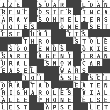 ACROSS 1. Ending with capital 4. Fly high 8. Grant temporary use of 12. French philosopher Descartes 14. Flexible twig of a willow tree 16. South American Indian 17. Like ___ of sunshine 18. Wine waiters 20. Lugs 22. Single 23. Put into a specified state 24. Compass dir. 25. Actor Linden 28. It is 30. Through, poetically 31. Fur scarf 35. "Barney Miller" actor Jack 37. Conclusions 40. Migrant worker of the '30s 41. Indian skirt 42. Representative 44. SW Asia republic 45. Mountain range 46. Overwhelm 47. Auto 48. Artist's stand 50. Armed conflicts 52. Small child 54. Compass dir. 55. _-fi 58. Mouth or opening 61. Bit 63. Eroded 65. Frustrating wastes of time 70. Small bottle 71. Toward shelter 72. Give a jingle 73. Otherwise 74. For fear that 75. Domed church section 76. Allow DOWN 1. Feeling or showing extreme anger 2. Nothings 3. Related on the mother's side 4. Mayday 5. Bear (Spanish) 6. Direct toward a target or goal 7. San ____ (Riviera town) 8. Cards in a Roman deck? 9. Washington bills 10. 1/640 square mile 11. Political cartoonist Thomas 13. Sight organ 15. Painter Guido (1575-1642) 19. Allows 21. Quiet! 26. Type of rug 27. Yearns 29. Unemotional ones 30. Bathroom 32. Gumbo ingredient 33. One who doesn't tell the truth 34. Car or cant ending 35. "Two Mules for Sister ____" 36. Mouths or openings 38. Lair 39. Overwhelms 41. Take to court 43. It was, poetically 49. Globular water bottle used in Asia 51. To separate or throw off 53. Canvas cover 55. Free of sound 56. Desist 57. An arm off of a larger body of water 58. Spoken 59. Cause heat under the collar 60. Eras 62. Capital of the state of Qatar 64. "___ Maria" 66. Was introduced to 67. Chop off 68. Followers of ems 69. Perceive with the eye