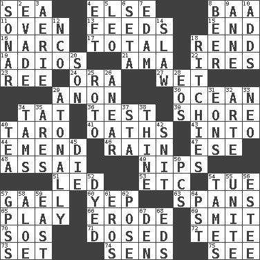 ACROSS 1. Ocean 4. Otherwise 8. Sound made by sheep 11. Baking chamber 13. Eats 15. Conclude 16. Drug cop 17. Add up to 18. Tear apart 19. Goodbye (Sp.) 21. Wet nurse (var.) 22. Angers 23. To separate or throw off 24. Mouth or opening 27. Soggy 29. Soon (poet.) 30. Sea 34. Make lace 36. Trial 39. Dinah or Pauly 40. Pacific island yam 41. Curses 43. To the inside or interior of 44. Make improvements or corrections to 46. Precipitation 47. Compass dir. 48. Slender Brazilian palm 49. Pinches, bites 51. Directed 53. And so on (abbr.) 54. Third day of the wk. 57. Highlander 60. Slangy assent 63. Connects, as a bridge 65. Romp 66. Eat (away) 69. Stricken, poetically 70. Distress signal 71. Administered medicine 72. False hair 73. Arrange properly for use 74. Elected reps. 75. Observe DOWN 1. Underwater navigation system 2. Elude 3. Nest on high 4. Bank Draft (abbr.) 5. Lion 6. Bristle 7. Dutch treat 8. Fermented drink made from hops 9. Singer Murray 10. Does sums 12. Non-commissioned officer (abbr.) 14. Cole _ (cabbage dish) 18. Actors Guy, Robert Welles, and Clint 20. Male child 25. Printing process, for short 26. Approach 28. Greek goddess of the dawn 29. Lacking a tonal center or key 31. Immeasurably long periods of time 32. Johnson of "Laugh-In" 33. Modern: prefix 34. Scottish caps 35. Ancient Greek god of war 37. R.R. building 38. One or ones belonging to thee 40. Beverage made from leaves 42. In a ____ (agitated or irritated) 45. Expire 50. Personal Computers (abbr.) 52. Colored 54. Domesticates 55. Join together 56. First name in cosmetics 57. Global Positioning Systems (abbr.) 58. Medicinal plant 59. Compass direction 61. Greek god of love 62. Airs 64. Pacific Standard Time (abbr.) 67. Lair 68. Begley and Asner