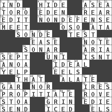 ACROSS 1. Indiana (abbr.) 4. Flintstone garb 8. Toward the sea 12. "Corrida" creature 14. Genesis locale 15. Bring up, as a child 16. Prepare for publication 17. Unrelated to defense, as in spending 20. Confront 21. Bear (Spanish) 22. "One Day ___ Time" 23. Message 27. Trial 29. Relaxation 31. Short letter 34. Echolocation 35. Roberta Peters solo 36. Back-to-school mo. 39. Single; one (prefix) 41. Is not 42. Small Philippine buffalo 43. Perfect 46. Sharp bark 47. Snakelike fish 48. Not this but _ 51. Having winglike extensions 54. Slender fish 56. Not either 58. Angers 61. Conciliate 66. Be footloose 67. Portico 68. Amused look 69. Singer Brickell 70. Post 71. On the rocks 72. Raised railways DOWN 1. A distinct part 2. Thickened enlargement 3. Frees from moisture 4. Layer 5. Wedding promise 6. Lair 7. Inside; within (prefix) 8. "We ___ not amused" (Victoria) 9. Legislators 10. 90 degrees 11. Type of rug 13. Von Bismarck 18. Eastern Standard Time (abbr.) 19. Enemy 24. Modern: prefix 25. One of the 12 tribes of Israel 26. He sold his birthright 28. Slow-paced one 30. Bert's buddy 32. Metal container 33. Ingest 34. Staphylococcus 36. Declare 37. Compass dir. 38. Coward 40. The main thing one is thinking about 44. Pipe bend 45. White ___ sheet 49. Black tropical American cuckoo 50. Small child 52. Hoop that covers a wheel 53. Eat (away) 54. Global Positioning Systems (abbr.) 55. Johnson of "Laugh-In" 57. Swiss mountan, "Queen of the Mountains" 59. Tending to cause great harm 60. Perceives with the eye 62. Writing tablet 63. Curve 64. Neckwear 65. Conclusion
