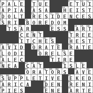ACROSS 1. Light colored 5. Third day of the wk. 8. Needle holder 12. Capital of Western Samoa 13. White ___ sheet 14. Robbery 15. Stupid person 16. Dwellings 19. Indian title of respect (Mr.) 20. Mood resulting from idleness 21. Russian ruler of old 23. Curvy letter 24. Tate display 27. Penny 30. Relationship diagram 31. Irritating cutaneous sensations 34. Command 35. Enthusiastic 38. Declaim 40. Pace 41. Farming town in central California 42. Threatening words 44. Actor Baldwin 45. Become fatigued 46. Teachers' org. 47. Domesticated feline 50. Capri or Wight 53. Speakers 57. "___ Maria" 59. Supplying deficiencies 63. Supplemented with great effort 64. N. Chile seaport 65. Lair 66. Painter Guido (1575-1642) 67. Sliced desserts 68. Compass dir. 69. Johnson of "Laugh-In" DOWN 1. Writing tablets 2. To the left, to Queeg 3. Ms. Damita and namesakes 4. Ingest 5. Edible starchy tuberous root 6. One who uses or employs something 7. Relaxation 8. Car or cant ending 9. Nervous spasm 10. Purpose 11. ___ a Wonderful Life 14. Cloth borders 17. Binary compound 18. Two (Sp.) 20. Cy Young winner Saberhagen 22. Being or containing an acid 24. Type of rug 25. State of inaction 26. Wig 28. Non-commissioned officer (abbr.) 29. Through, poetically 30. Triplets 32. Ewer handle 33. Proofreading order 35. Actor Alda or Thicke 36. Grand slam 37. It may be bright or harebrained 39. Biblical high priest 43. Indian titles of respect 47. Root beer relative 48. "We ___ not amused" (Victoria) 49. Make lace 51. Member of a famous L.A. basketball team 52. Happening 54. Event that recurs at intervals 55. Baking chamber 56. French philosopher Descartes 58. Singer Brickell 59. Plant excrement 60. RI univ. 61. Sliced dessert 62. Personal Computers (abbr.) 63. Epoch