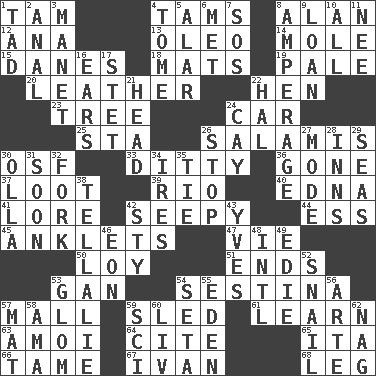 ACROSS 1. Scottish cap 4. Scottish caps 8. ____ Jay Lerner 12. Santa ___, CA 13. Butter sub 14. Undercover agent 15. Natives or inhabitants of Denmark 18. Floor protectors 19. Diluted with white 20. Cordwainer's material 22. Layer 23. Family _ (genealogy) 24. Automobile 25. R.R. building 26. Deli grouping 30. Order of Saint Francis (abbr.) 33. Short, simple song 36. Went 37. Plunder 39. River (Sp.) 40. Pulitzer Prize-winning author Ferber 41. Old wives' tales, e.g. 42. Oozy 44. Double-curved letter 45. Short socks 47. Compete 50. Myrna of the movies 51. Conclusions 53. Separate the seeds from cotton 54. French poetic form 57. Shopping center 59. Downhill vehicle 61. Acquire or gain knowledge or skills 63. Mine, in Marseilles 64. Quote 65. Call ___ day 66. Not wild 67. _ the terrible 68. Part of a journey DOWN 1. Small amount or degree 2. Of or related to the anus 3. French painter Edouard 4. Heavy book 5. Having or resembling wings 6. Was introduced to 7. Mayday 8. Electrical Measurement 9. Grant temporary use of 10. 100% 11. Born 16. Hearing organs 17. Proofreading order 21. Froth on beer 22. Actor Linden 24. Island 26. Cease 27. Method 28. Restaurants 29. Oceans 30. Rounded earthenware pot or jar 31. Within a short period 32. Tined utensil 34. Angers 35. Make a knot 38. Copy Pinocchio 42. Filthy place 43. Jacques Cousteau's middle name 46. Period of immesurable duration 48. International (abbr.) 49. Singer Brickell 52. Slow-paced one 53. Seize upon or latch onto something 54. Bristle 55. Paradise 56. Johnson of "Laugh-In" 57. Floor covering 58. Nanny (var.) 59. _-fi 60. 54 in ancient Rome 62. Tired old horse